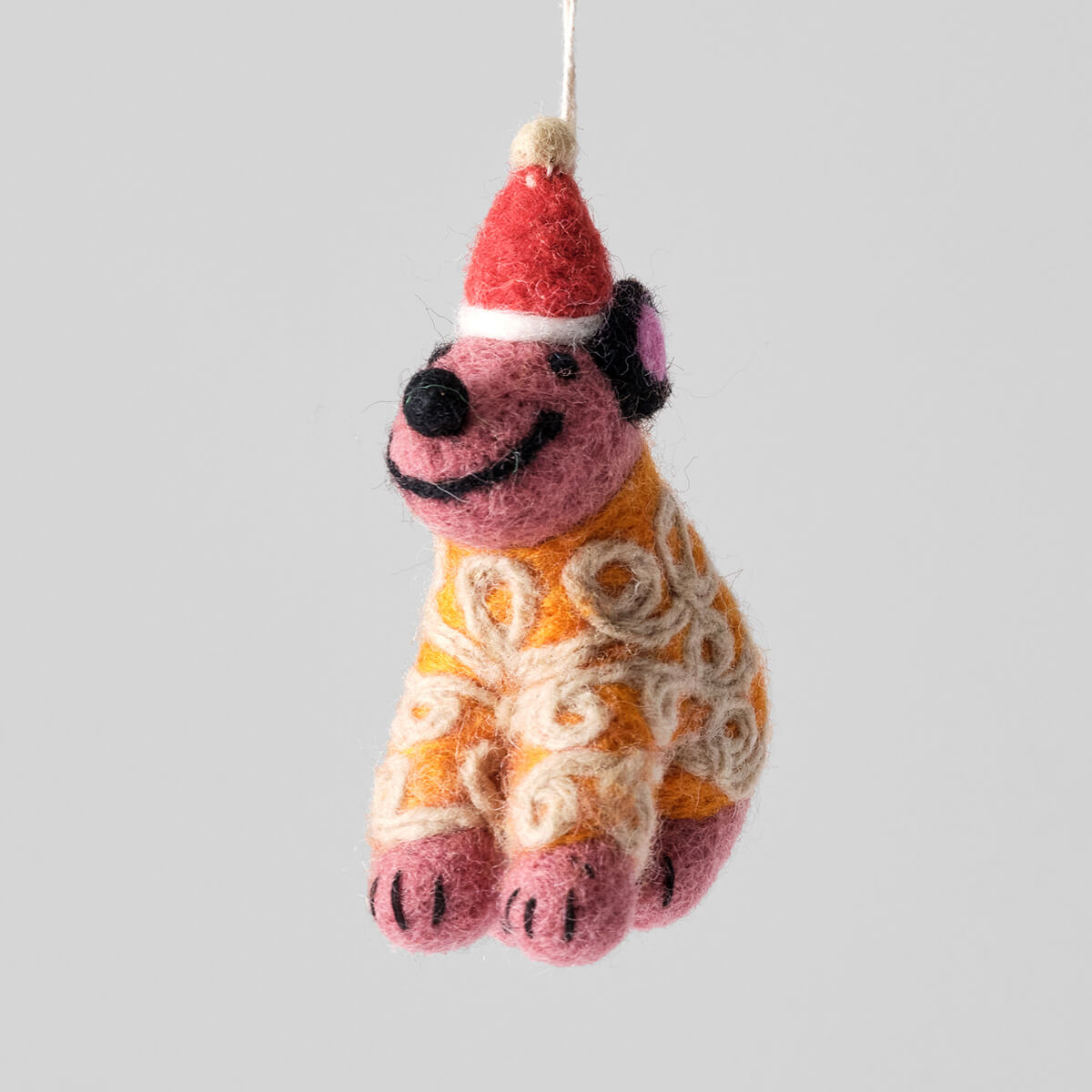 Pippin Dog With Orange Jumper Felt Decoration by Wrap. Hand needle felted hanging Christmas tree decoration. Pippin the dog is sporting a Christmas hat and woolly jumper.