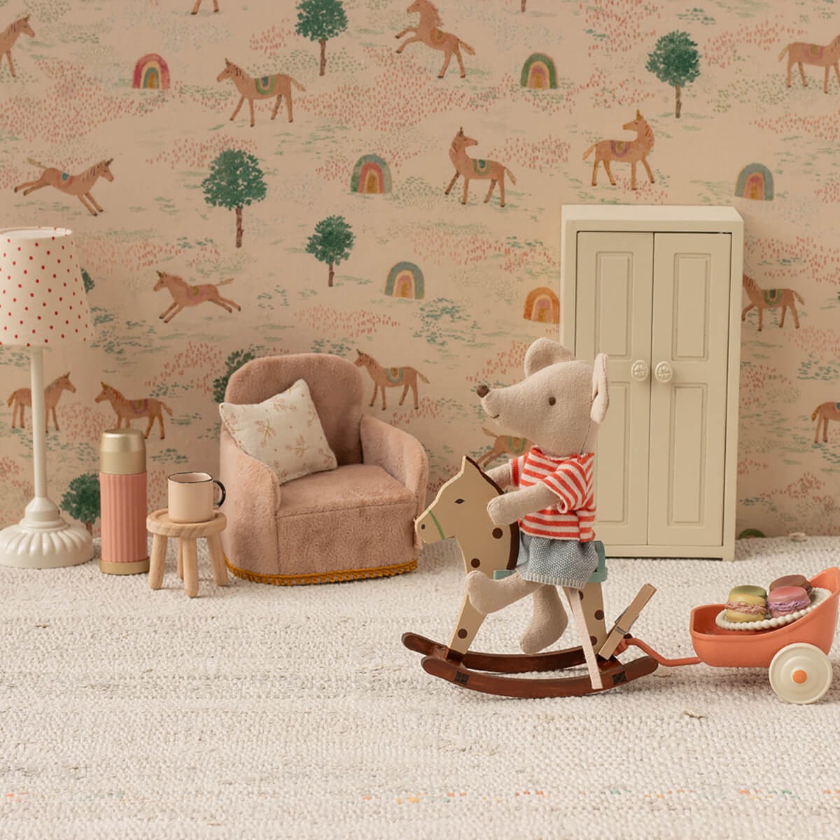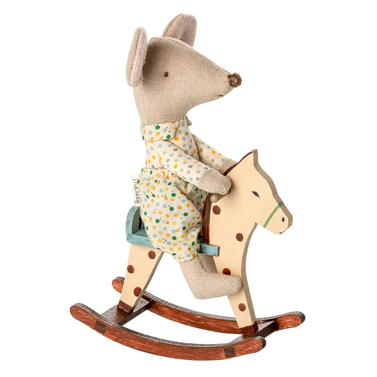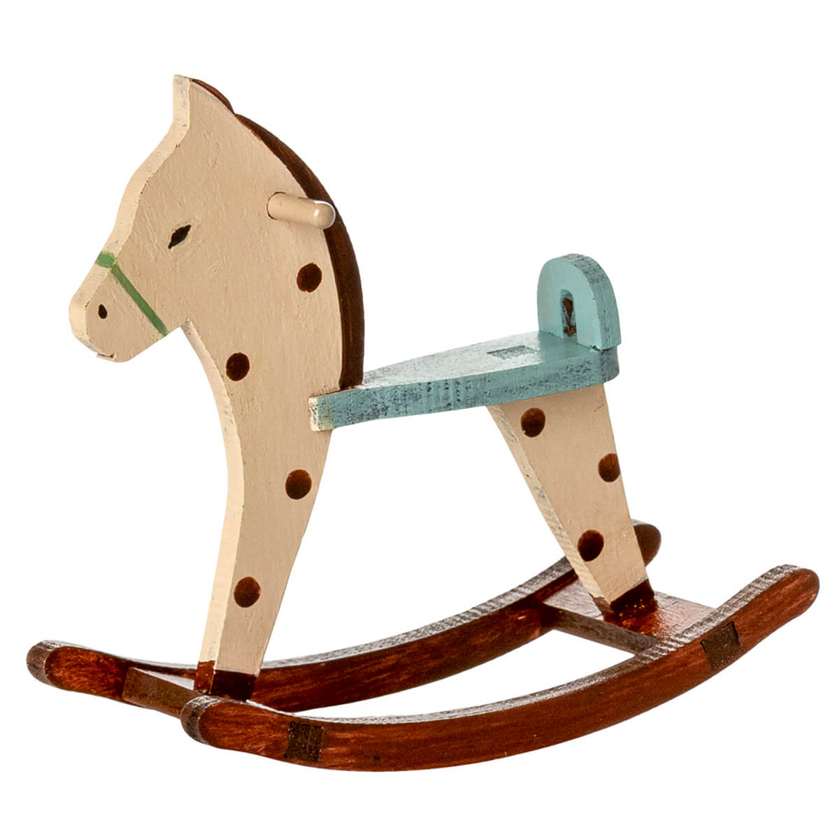 Rocking Horse by Maileg. This wooden rocking horse is a must have for all playful mice. Its metal handles make it easy for mice with magnets in hands to hold on and the small hole for the tail ensures a nice ride. Fits size little- and bigbrother/sister mice.