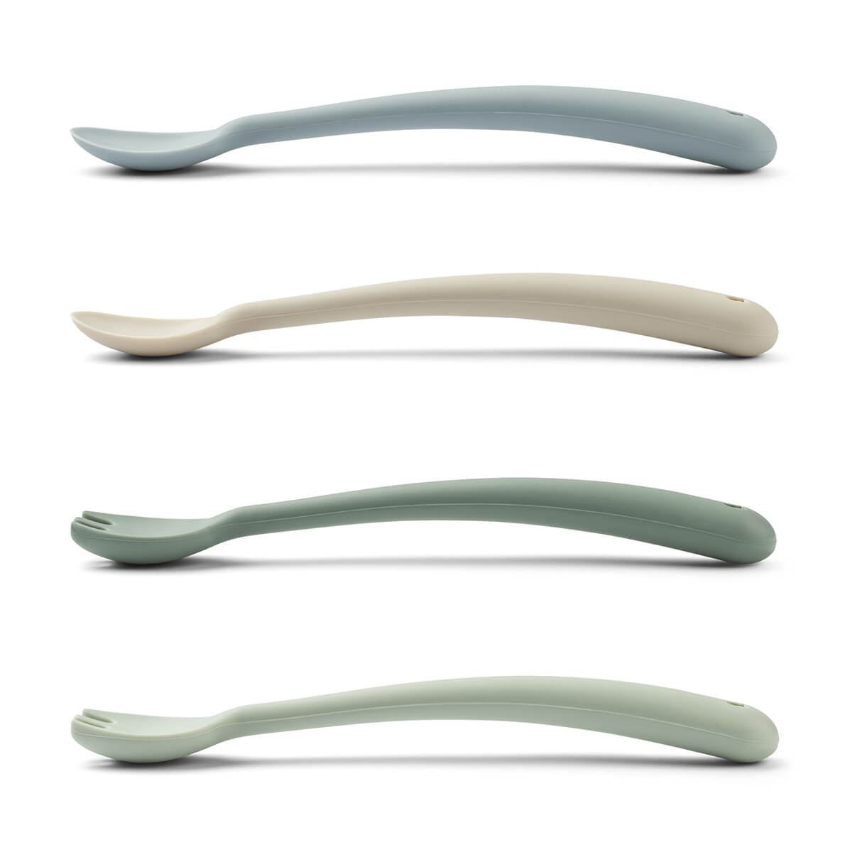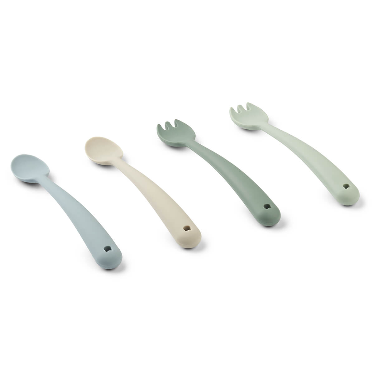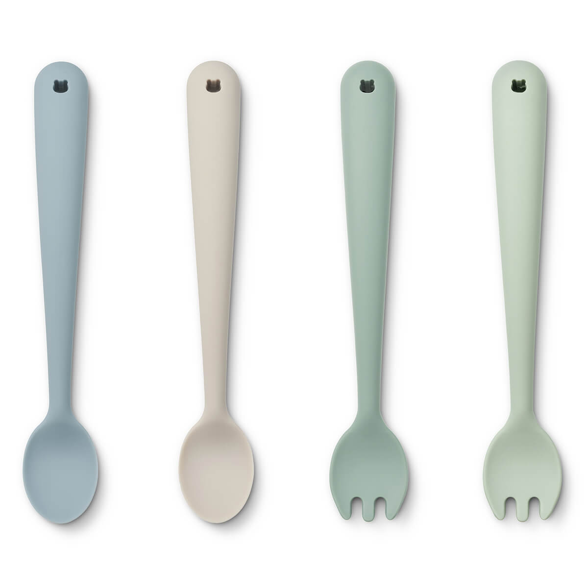 Shea feeding set by Liewood.  Set includes two Siv feeding spoons & two Scott feeding forks. Durable, lightweight and perfect for little hands and mouths.  Dishwasher safe.