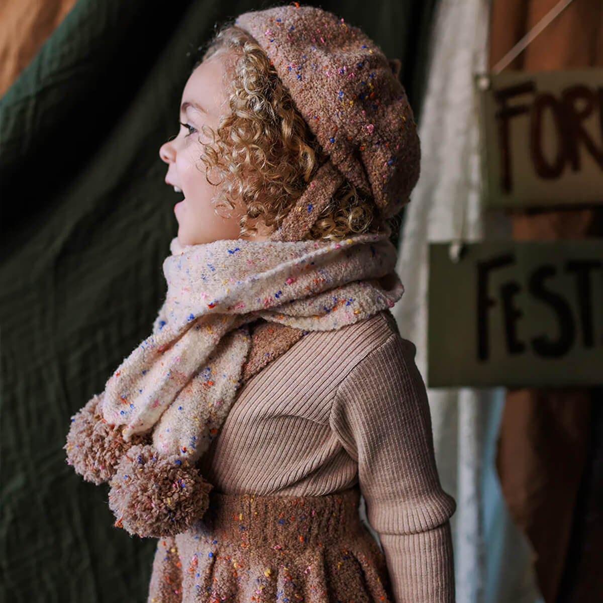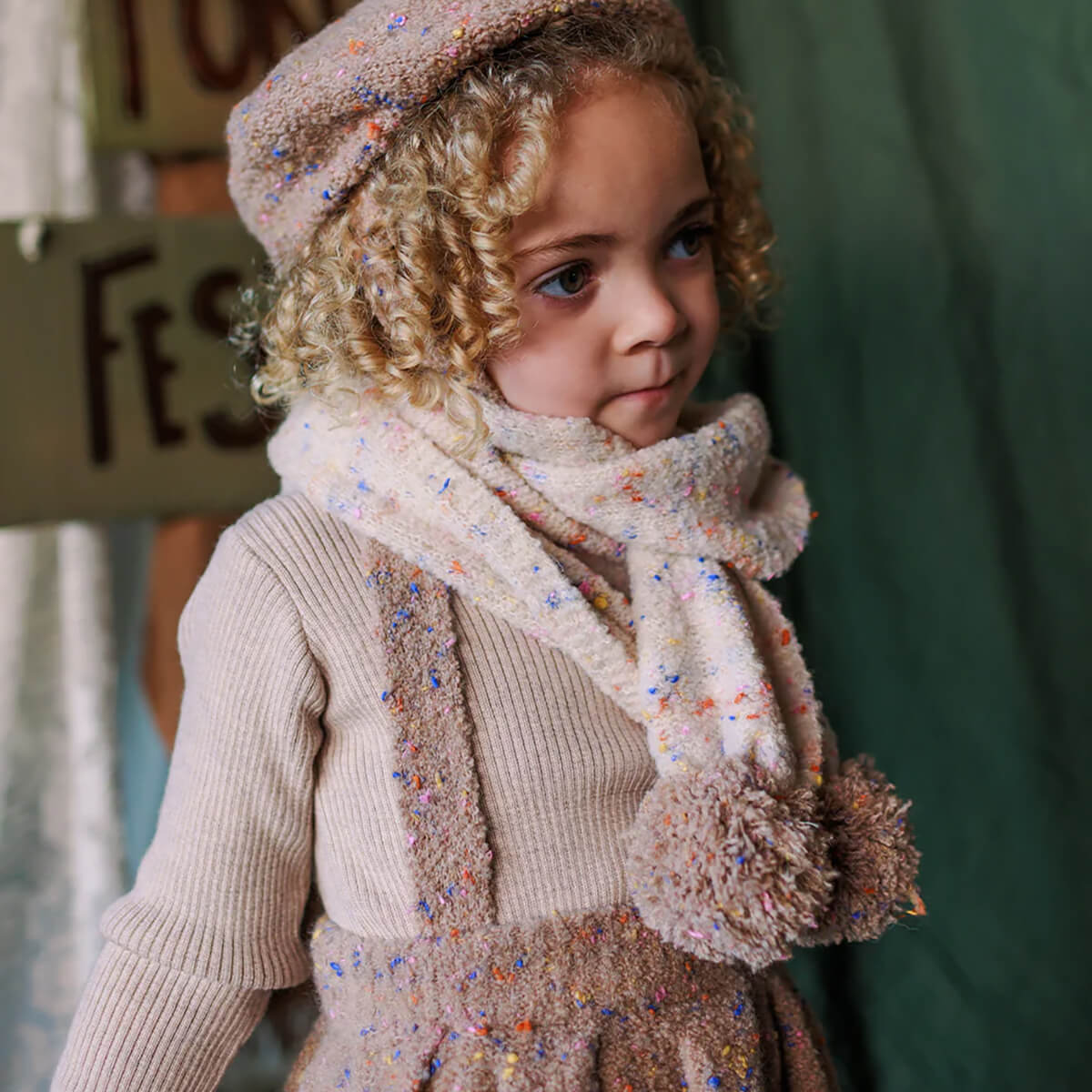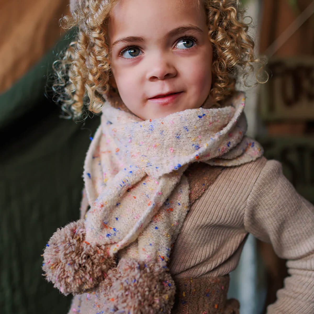 Sprinkles Scarf by Mabli. A cosy scarf with contrast poms. Knitted in reverse stitch to accentuate the rainbow sprinkles twisted through the yarn.