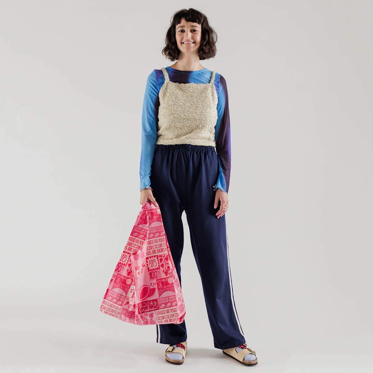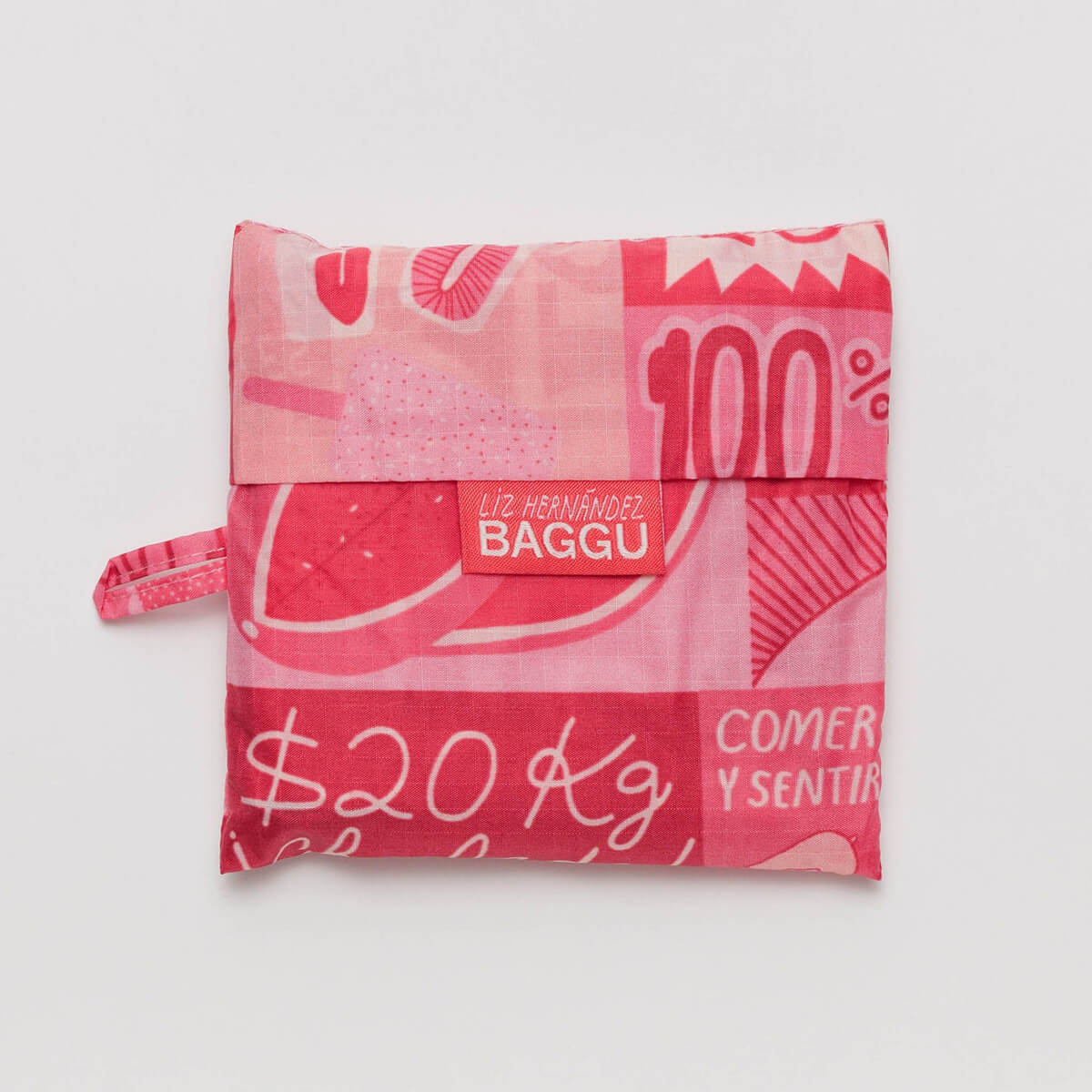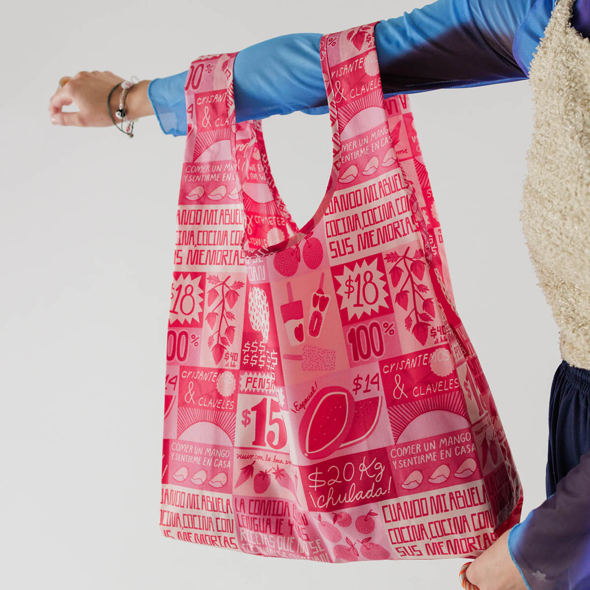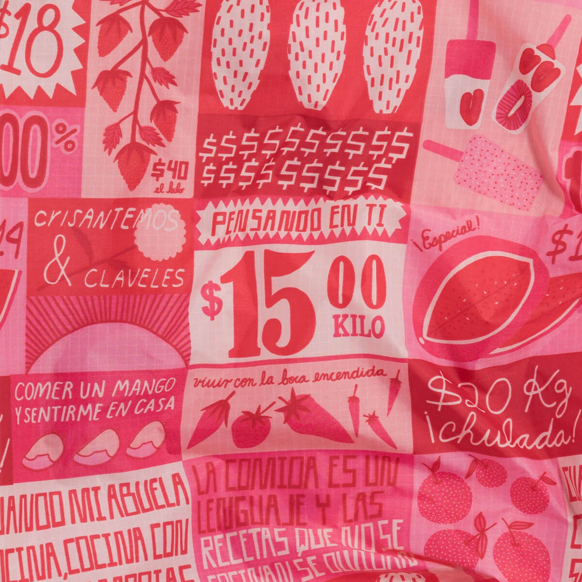 Features a design by Liz Hernández, a Mexican artist based in Oakland, California. Her art practice is deeply influenced by her memories and surroundings of Mexico City where she grew up. The Mercado bag draws inspiration from the Tianguis, the pop up markets that fill the streets of Mexico City with their pink tents and striking handmade signs. The bag features Liz’s interpretation of these signs, communicating food’s relationship to subjects like family and home.