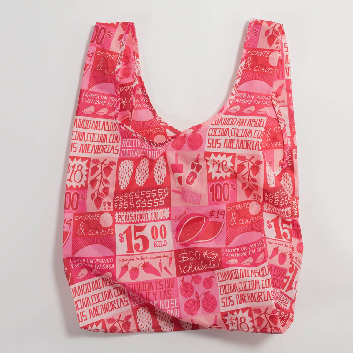 Standard bag by Baggu. Baggu's best selling reusable bag isn't just for the grocery store, it goes everywhere and hauls almost anything. Carries 2-3 plastic grocery bags worth of stuff comfortably in hand or over your shoulder.