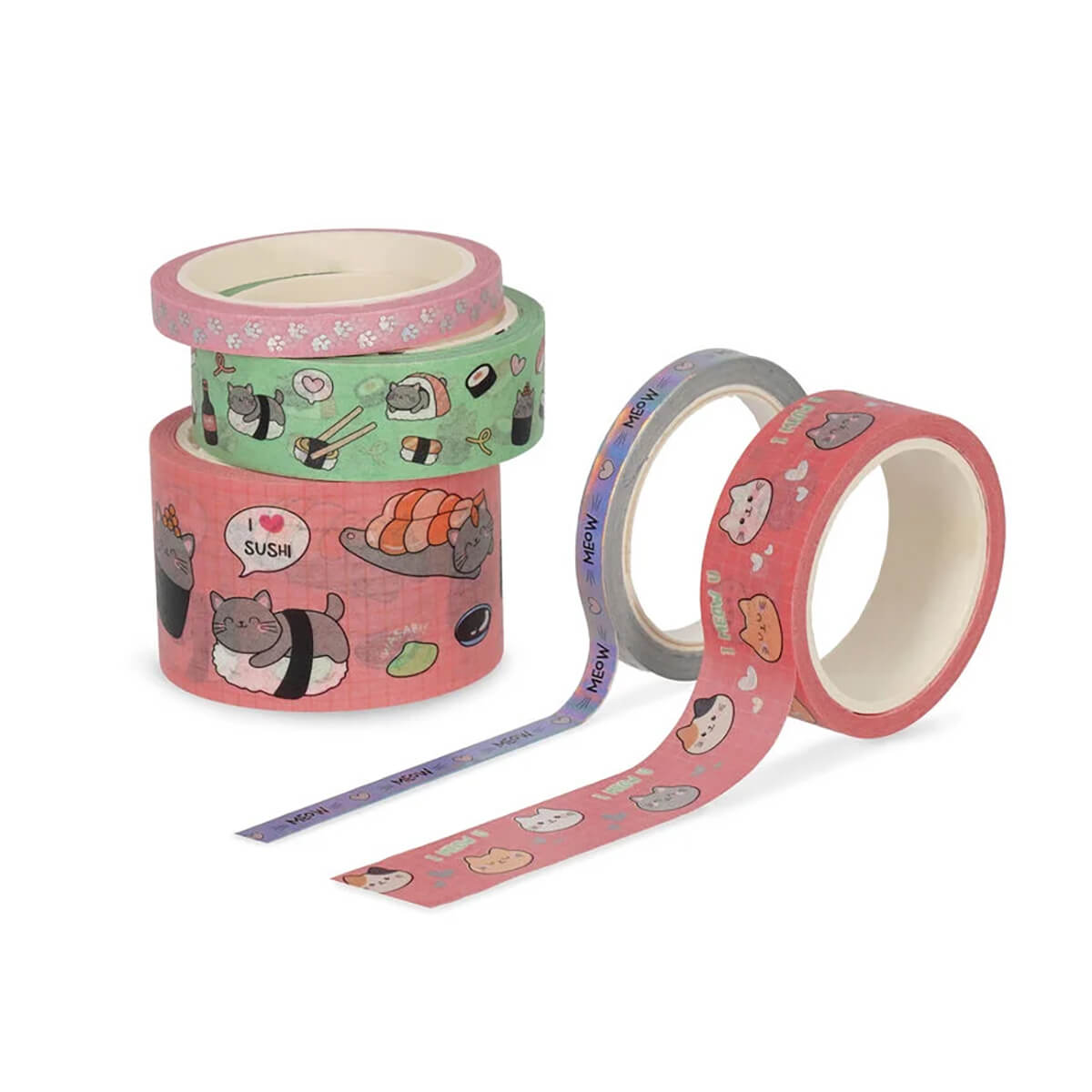 Sushi Cat Tape By Tape Box Of Five Paper Sticky Tapes by Legami. Five rolls of washi tape in various widths and cute designs. With a length of 5 metres and a vibrant palette, these sticky tapes will brighten up your packages, papers and collages instantly.