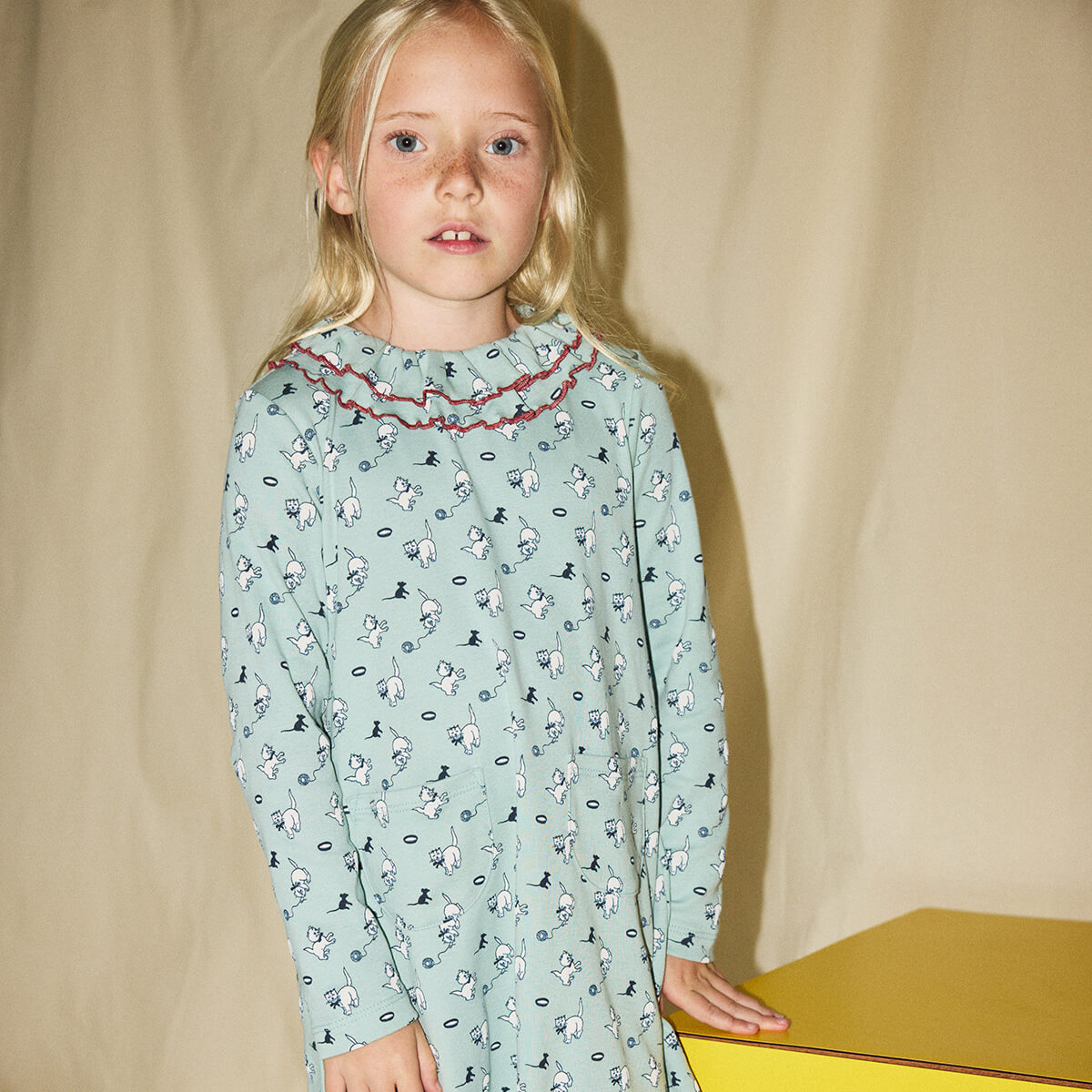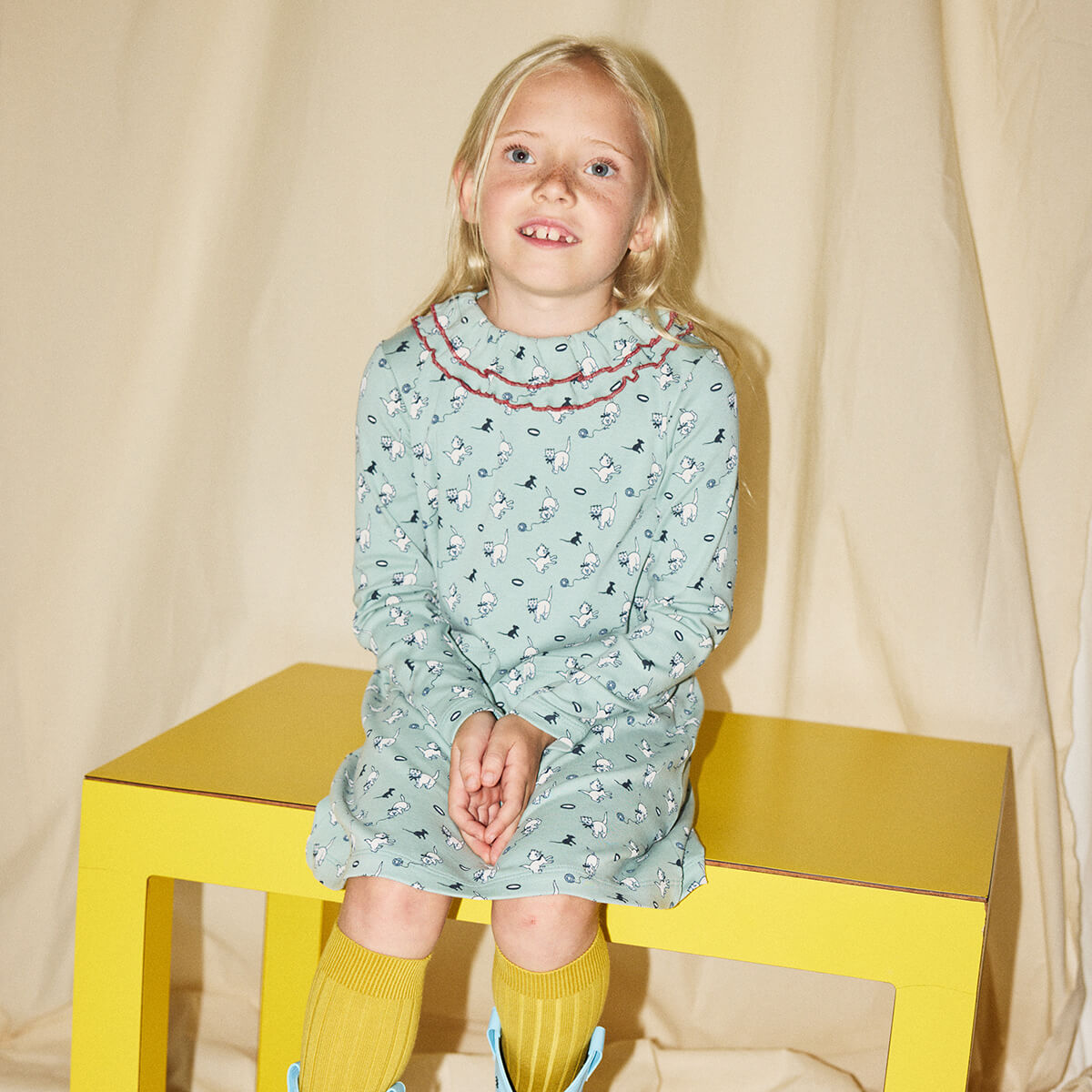 Sweetheart Dress by Misha & Puff. A swingy long-sleeved dress in organic Pima cotton, featuring two rows of gathered ruffles at the neck and a soft elastic wrist ruffle with contrast merrowed edge, and two front patch pockets.