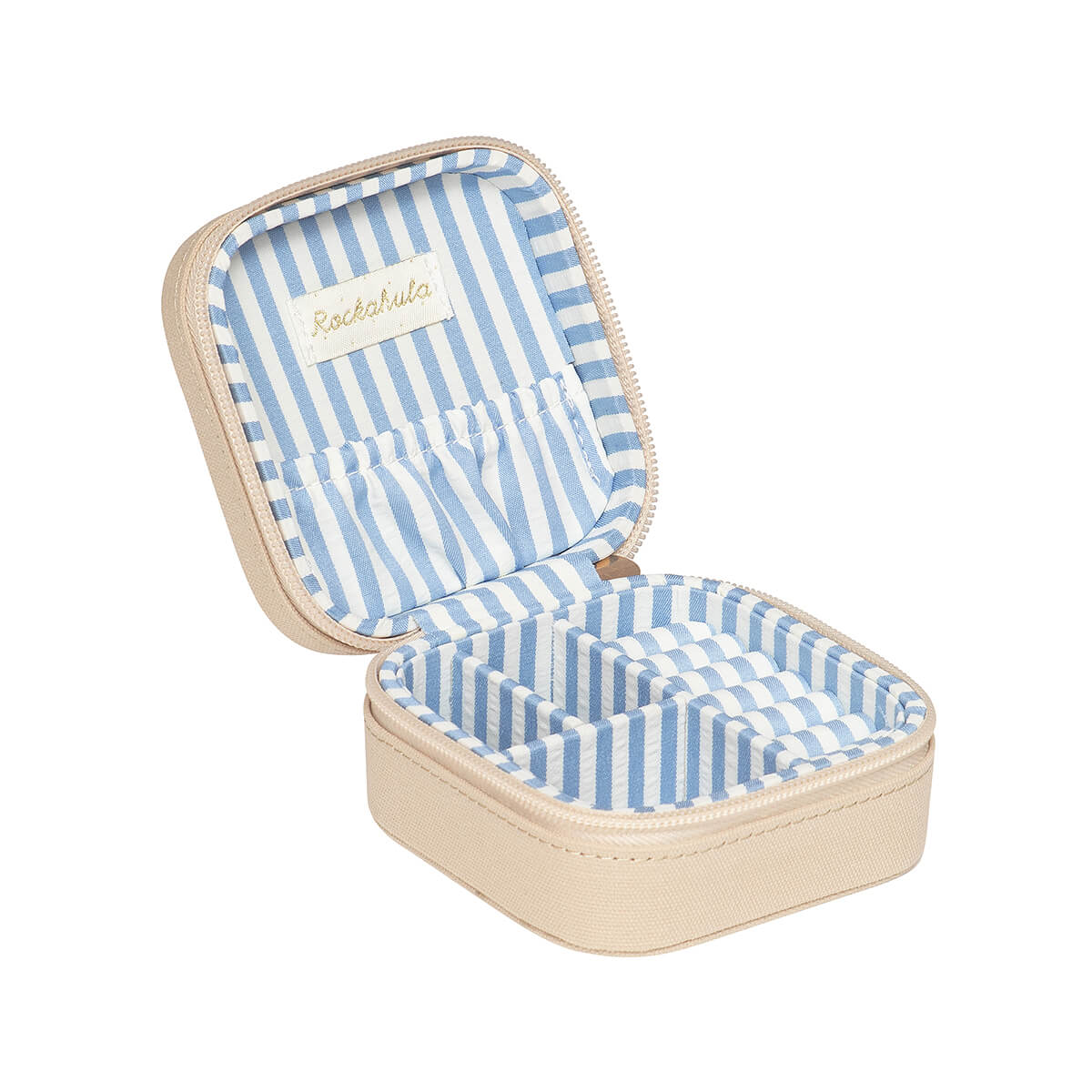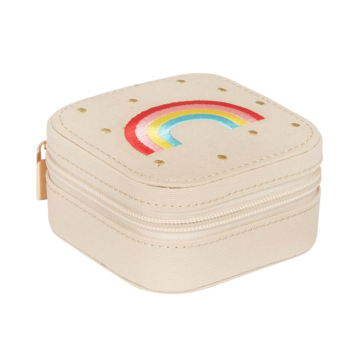 Vintage Rainbow Square Jewellery Box by Rockahula. This gorgeous square jewellery box is the perfect place to keep all your Rockahula jewellery and favourite treasures safe. Featuring bright rainbow motif embroidery, this jewellery box has a zip fastening to reveal three compartments, a slip pocket and a dedicated space to slot earrings and rings lined in a blue striped fabric.