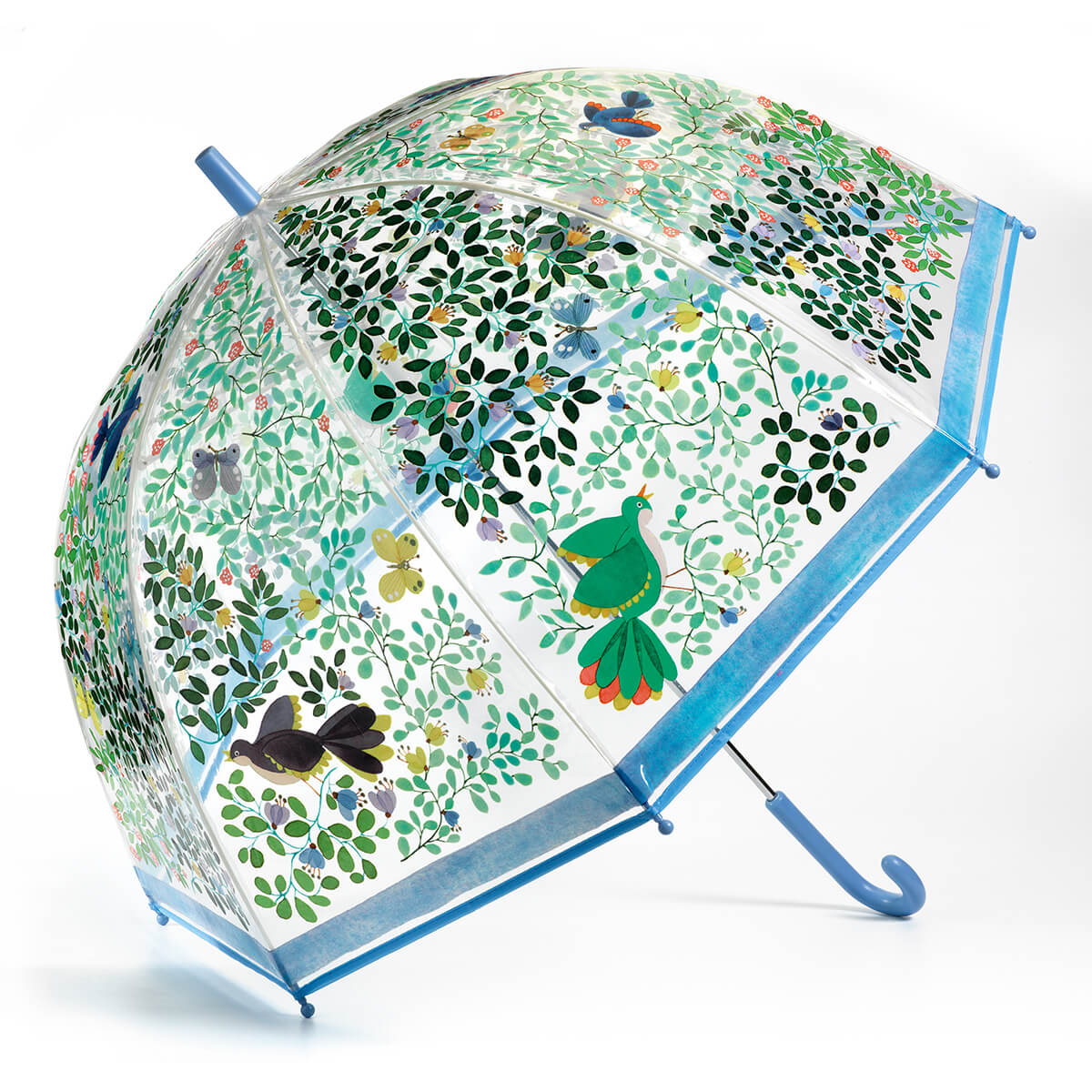 Wild Birds Adult Umbrella by Djeco. A chic and practical adult brolly featuring charming birds in a springtime setting. Its transparency allows you to see the scenery outside. The manual opening mechanism with a protective system allows you to open and close it without pinching your fingers. A colourful accessory, ideal for brightening up outings in the rain!