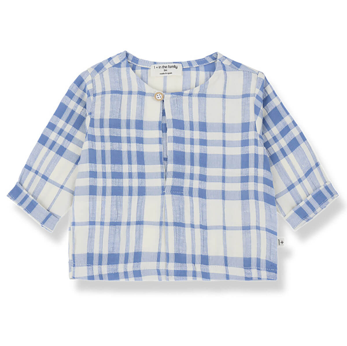 Ter Shirt by 1+ in the Family. A soft cotton-linen blend baby shirt with a front pleat detail and wooden button fastening.