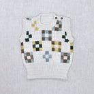 Quilt block vest by Iver & Isla. A sweet knit pullover vest with block pattern and button fastening at the shoulder.