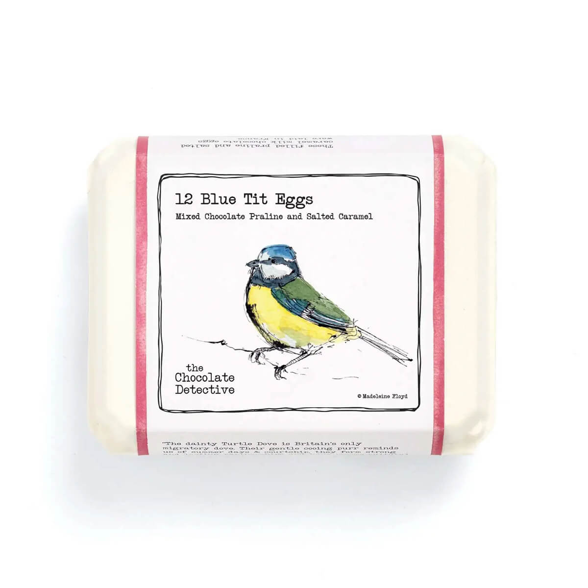 12 Blue Tit Eggs by The Chocolate Detective. 12 Chocolate Eggs, 6 filled with a fine hazelnut praline and 6 with a subtle salted caramel. Please note that egg colours may vary seasonally!