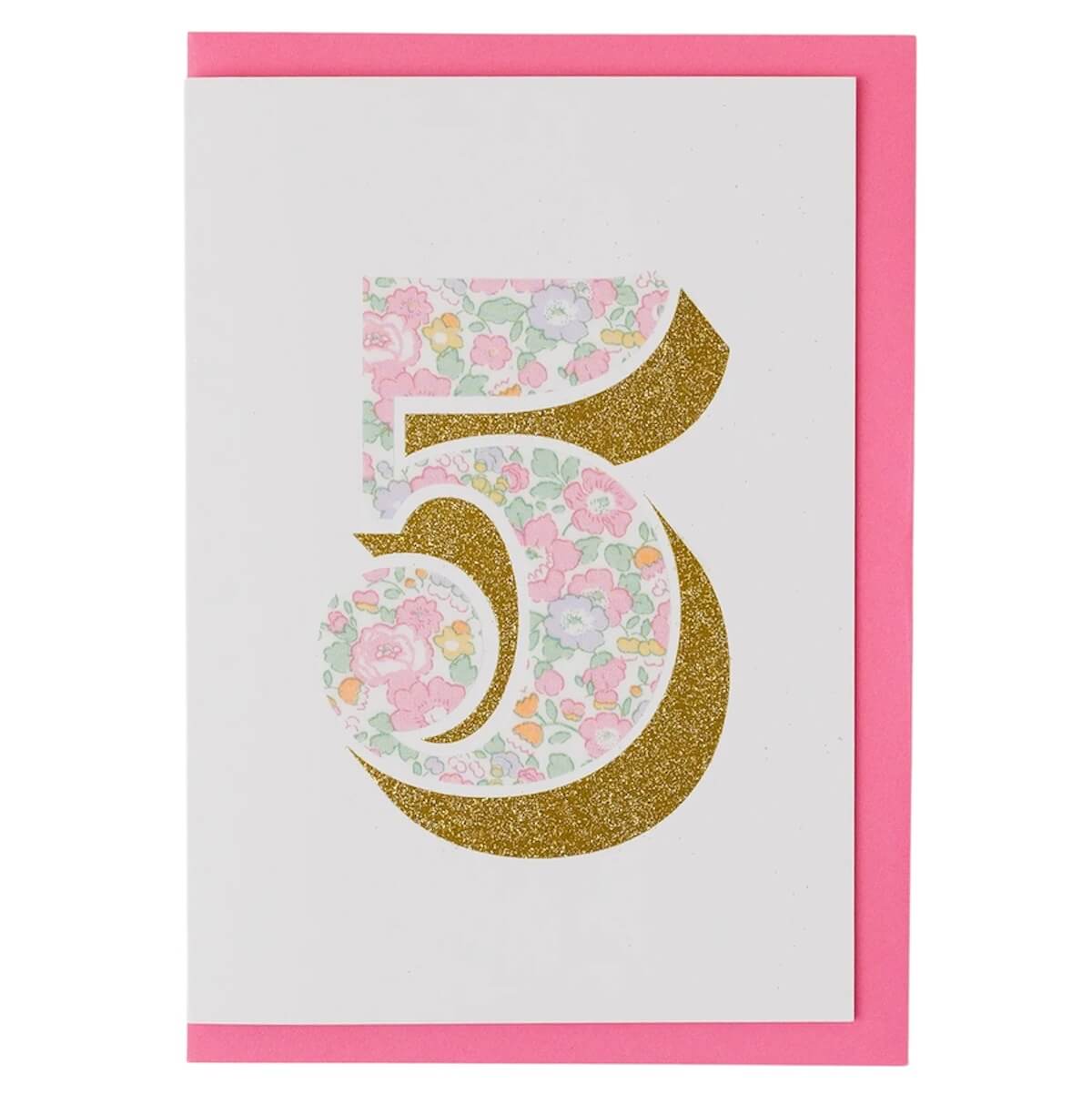 Age 5 Greetings Card in Betsy Ann Liberty Print by The Charming Press. Fifth birthday card featuring a beautiful glittery number print. Made with a biodegradable glitter. Celebrate those special childhood birthdays in style with this gorgeous, eco-friendly card!