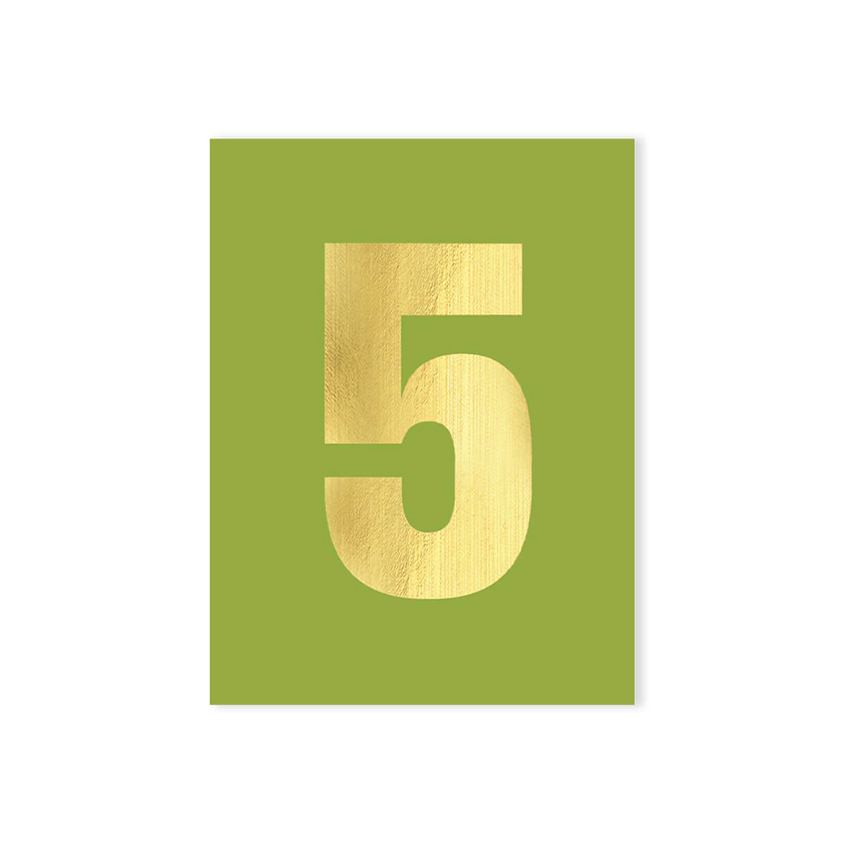 Age 5 Birthday Greetings Card by Kali Stileman Cards. A gloriously golden number five card! This mini card is perfect for birthdays or anniversaries alike. Set on a grass green background.