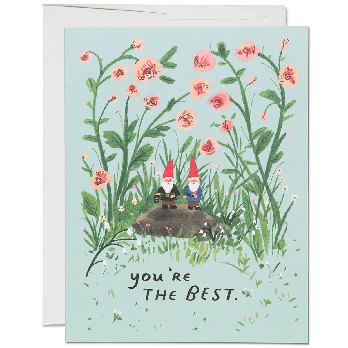 Garden gnomes friendship greetings card by Red Cap Cards. Features an illustration by Becca Stadtlander. Printed in the USA on heavyweight card stock. Blank inside with white envelope.