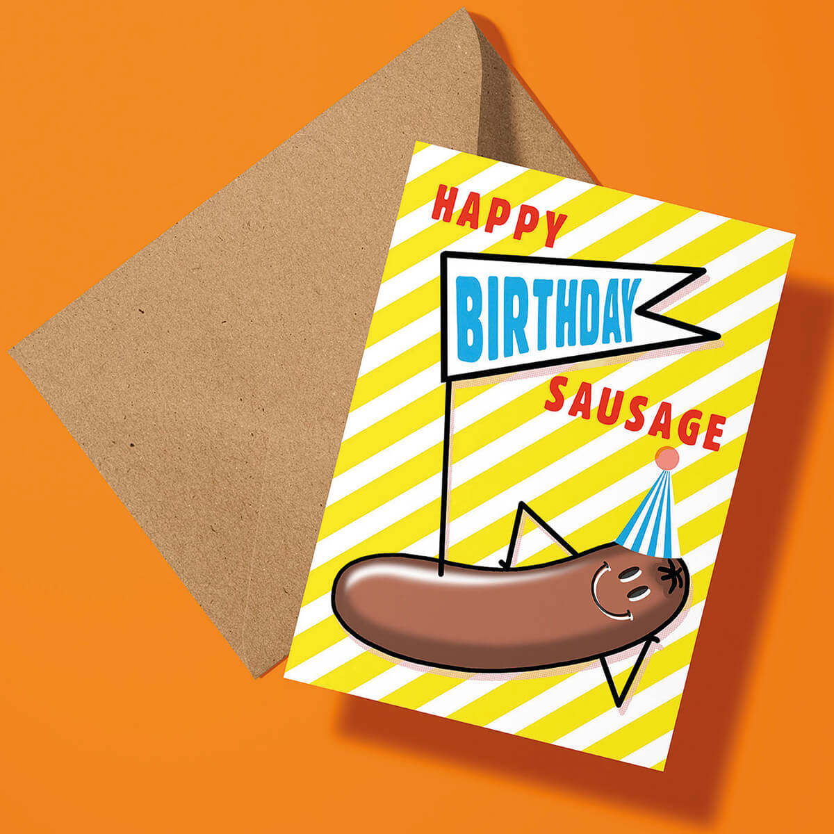 Greetings Card by The Design Dealership. Celebrate their birthday with bang(er). Sausage birthday card by The Design Dealership.