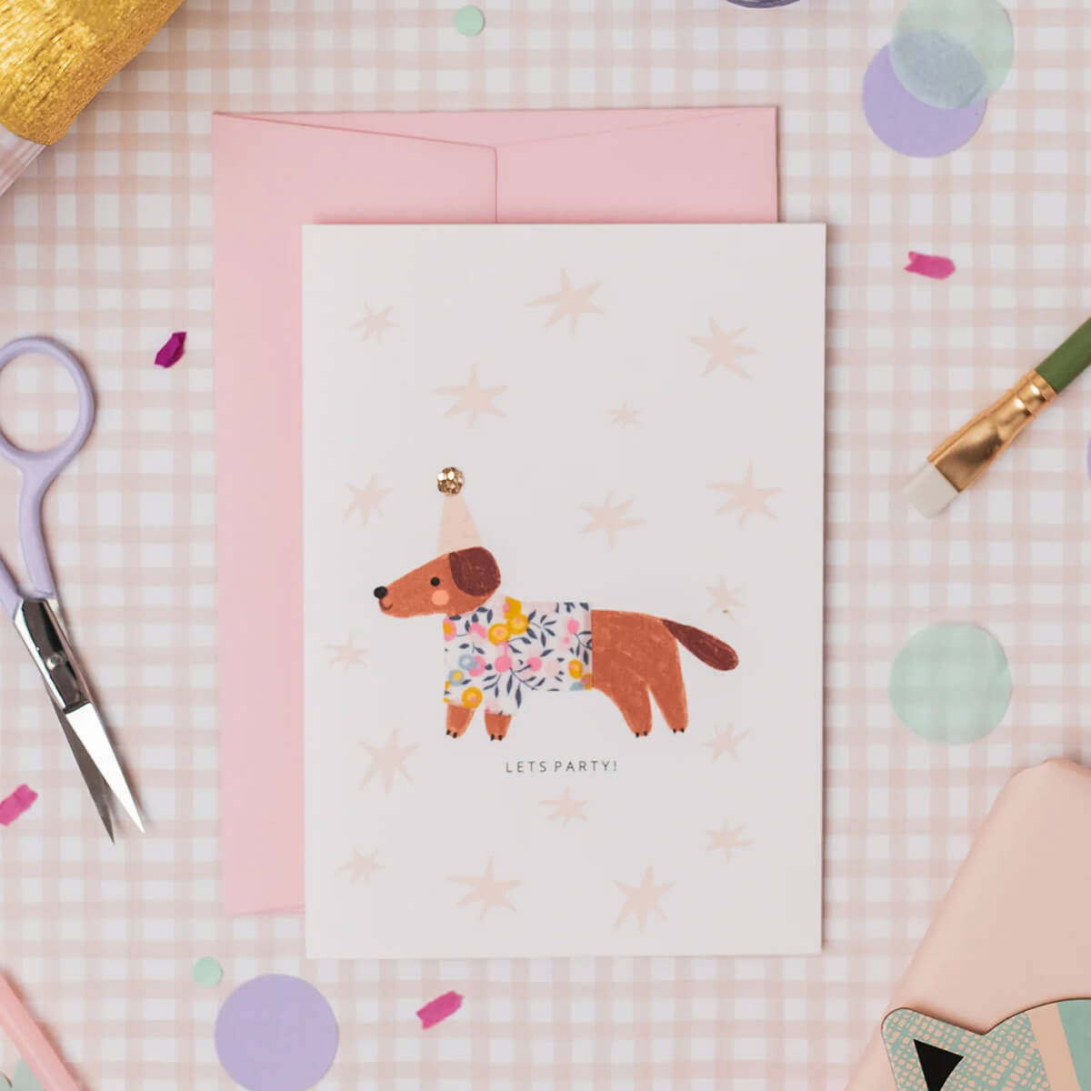 Liberty Sausage Dog Birthday Greetings Card in Wiltshire Bud Liberty Print by The Charming Press. A beautiful hand finished card featuring a dachshund in a Liberty print coat with a golden glittery bobble on her party hat. Let's Party message on the front. Made with Liberty tana cotton lawn and biodegradable glitter details. Blank inside for your own message. Pale pink envelope.
