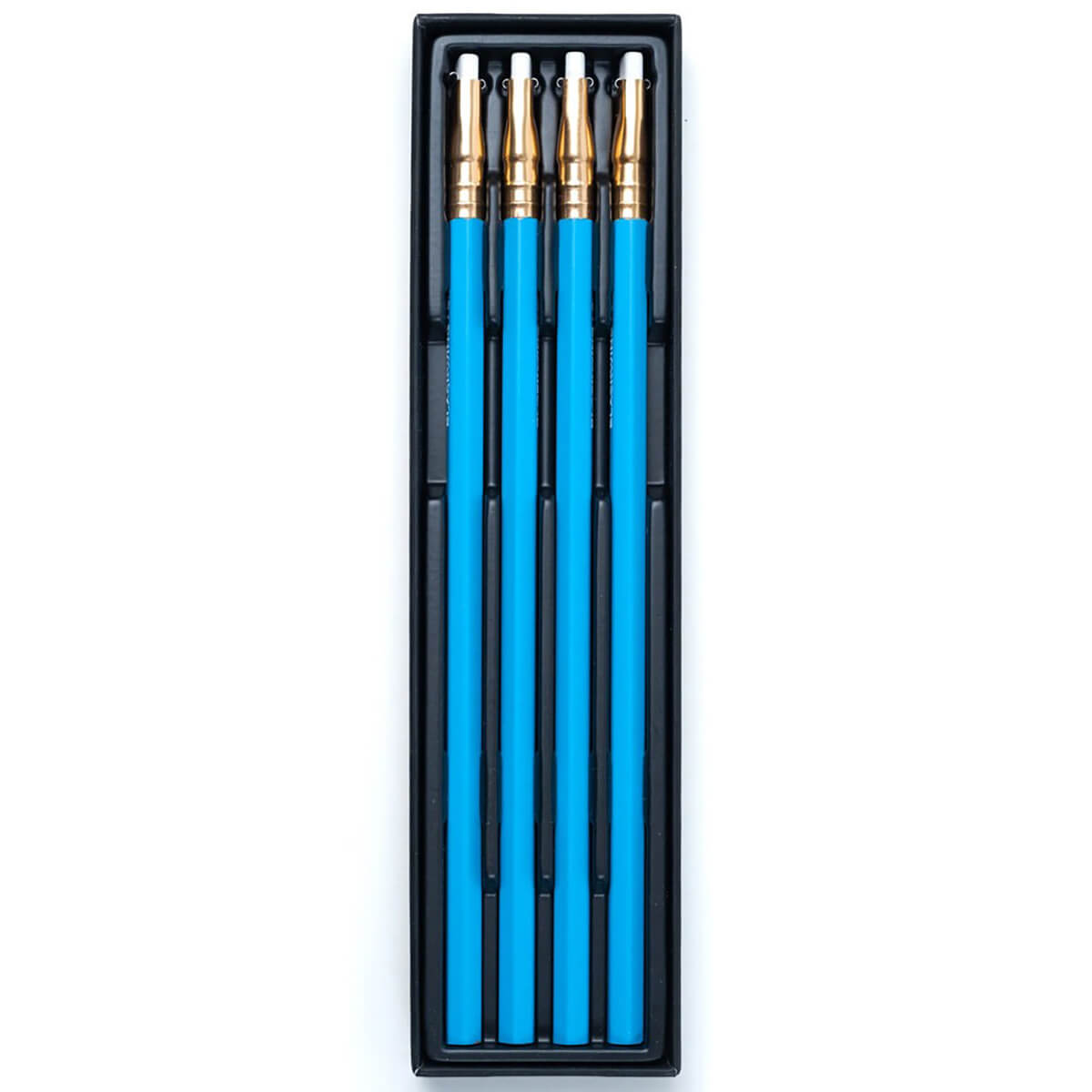 Box of 4 Blackwing Blue coloured pencils by Blackwing. This set consists of 4 pencils, each featuring a non-photo blue core that fades when scanned or photocopied, a unique feature that brings convenience to artists and illustrators. These pencils feature the same functional design aspects as other Blackwing pencils, including the large, rectangular eraser that can be extended as it wears down. The eraser is latex-free, and replacement erasers are available in a range of colours.