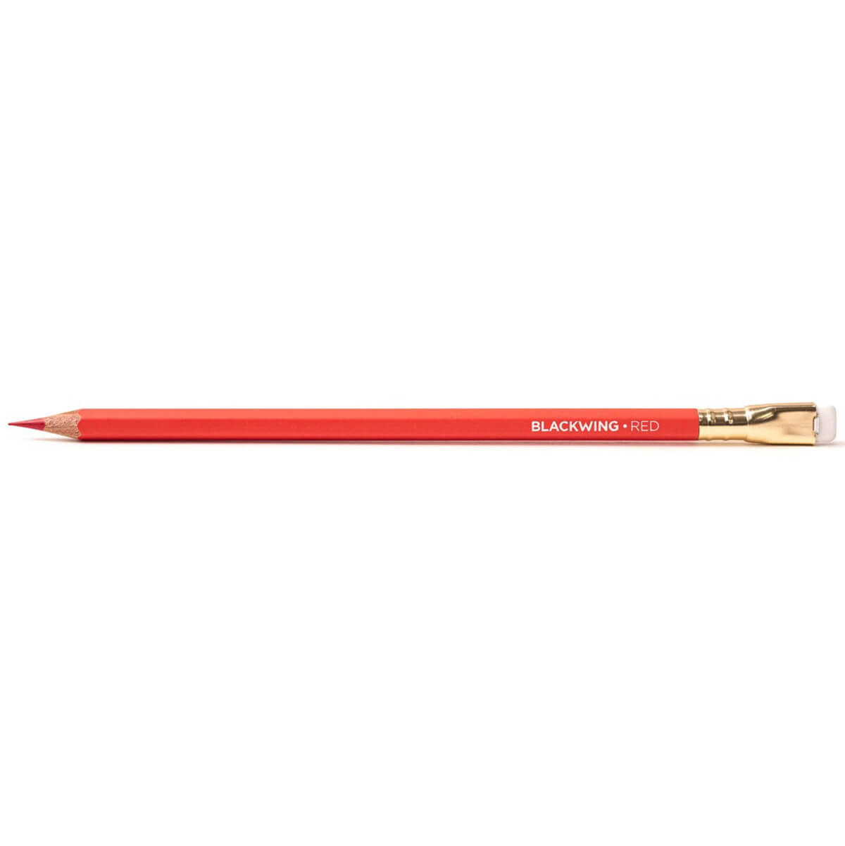 Blackwing Red coloured pencil by Blackwing. This pencil boasts a vivid red core, making it perfect for marking, editing, and sketching. Each pencil is adorned with a matte red barrel and gold ferrule, giving it a distinguished aesthetic that stands out in any stationery collection. The pencil features the same functional design aspects as other Blackwing pencils, including the large, rectangular eraser that can be extended as it wears down. The eraser is latex-free, and replacement erasers are available in a range of colours.