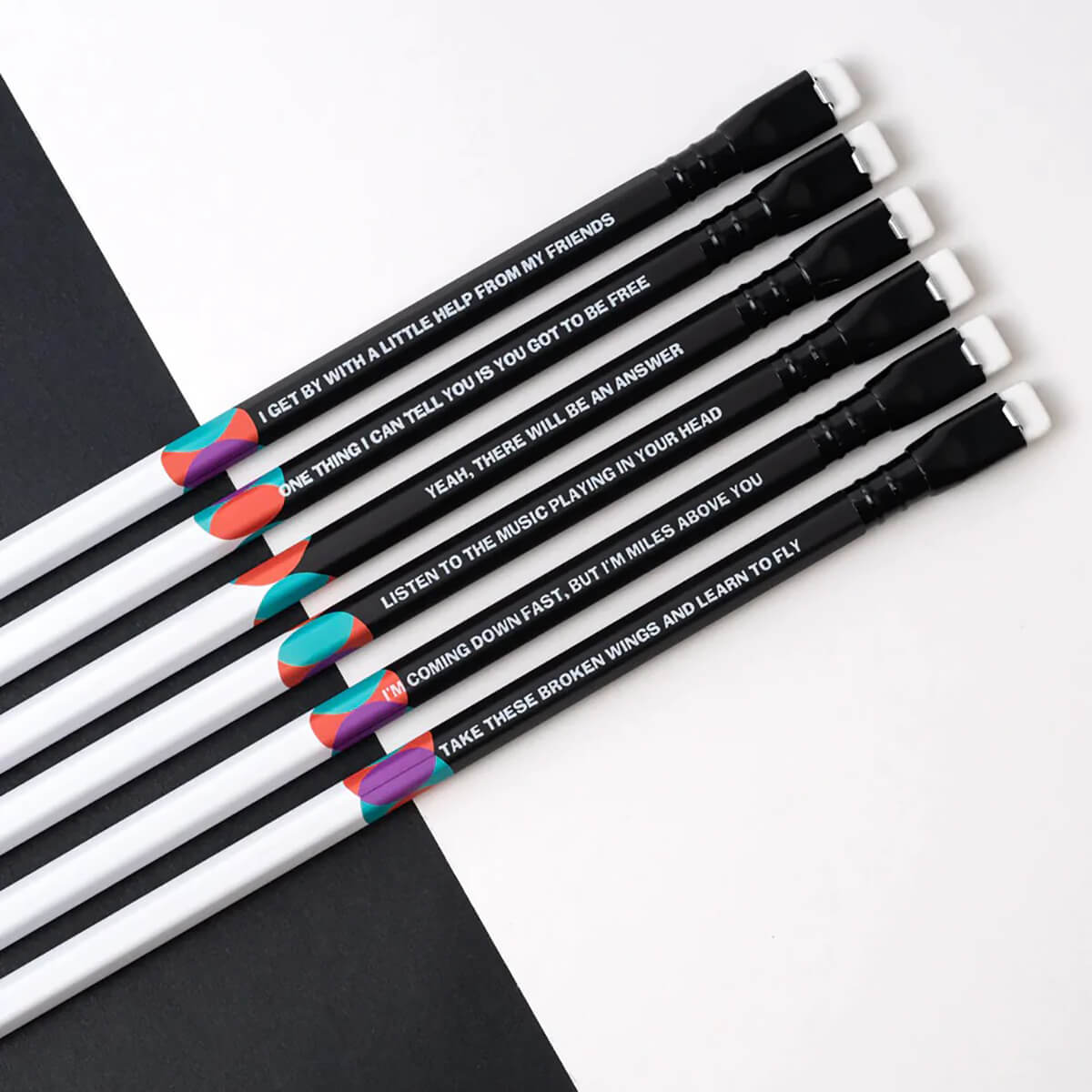 The Blackwing 192 is a tribute to John Lennon and Paul McCartney and the estimated 192 songs they wrote together. The color prism design depicts the convergence of two powerful creative forces. A different Lennon-McCartney lyric is foil stamped on each pencil, for a total of twelve different lyrics in the set. Includes extra-firm graphite.