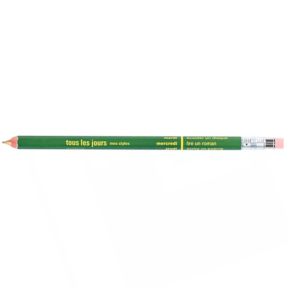 Days Mechanical Pencil With Eraser by Marks Inc. Super fine mechanical pencil with a hexagonal wooden body perfect for drawings, sketching and diagrams. The wooden casing of the Days mechanical pencil plays out the days of the week in French along with typical hobbies and events, such as reading a novel, taking a trip and watching a movie.