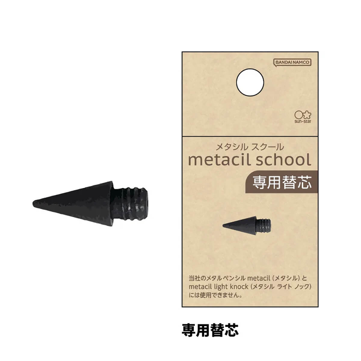 Metacil School Pencil Replacement Lead by Sun-Star Japan. Replacement tip for the Sun-Star Metacil School Bamboo Pencil. To replace the tip simply unscrew the old tip and screw in the new one. The tip makes a mark that is lighter than a normal pencil. Fits the Metacil school bamboo pencil only.