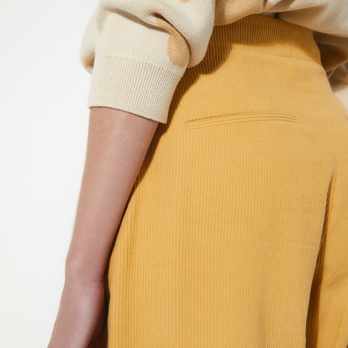 Foam Pants by Rita Row. Corduroy balloon, high-waisted trousers, with zipper closure, hidden button and hook-and-eye closure. Extra wide legs, slightly tighter at the hem, with front pleats, side bias pockets and inset back pockets.