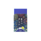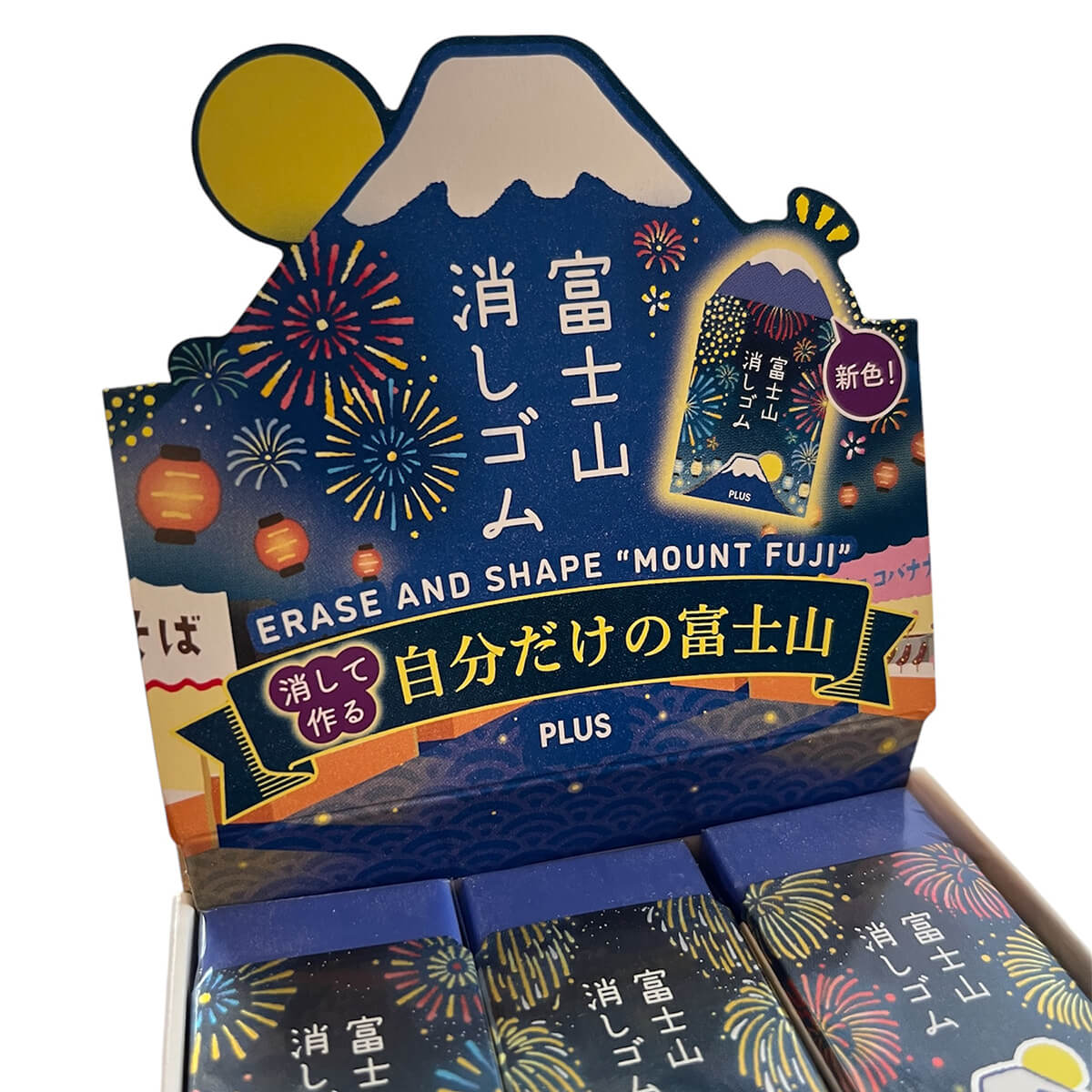 Air In Mount Fuji Summer Festival Fireworks Eraser by Plus Japan. Erase evenly in all directions — left, right, front, and back — and the eraser gradually takes on a mountain shape, revealing the iconic silhouette of Mount Fuji. With each use, the eraser changes shape and reveals a new expression, making the act of erasing itself a source of enjoyment. In a summer festival firework patterned case with foil stamping. Like the rest of the "Air-In" eraser series, this eraser is made with resin infused with porous ceramic powder, ensuring a light and smooth erasing experience.