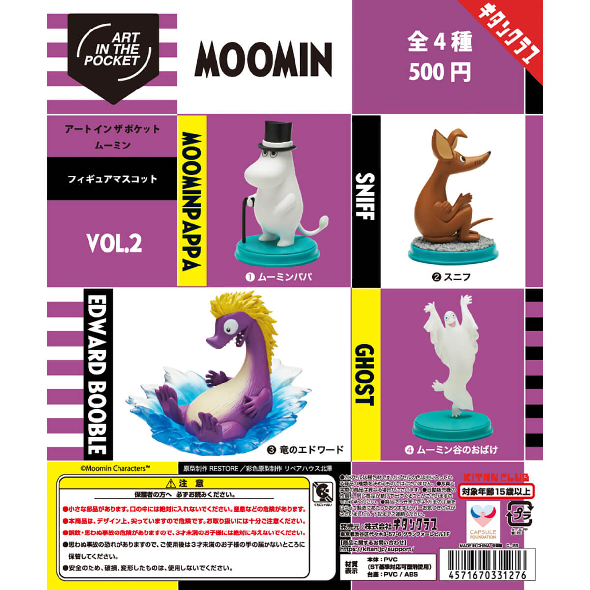 Art In The Pocket Moomin Vol. 2 Gachapon Capsule Collectible by Kitan Club. Highly collectible and authentic Japanese gachapon capsule containing one of four different Moomin figures. The latest addition to the popular Art In The Pocket series. In addition to the main characters Moominpappa and Sniff, Edward the Dragon, who is rarely made into a three-dimensional figure, is produced in a large size that evokes the original. In addition, the Moominvalley Ghost has been made into a figure with great attention to detail, even for the supporting characters, using clear parts so that half of his body is visible, just like a ghost. The lineup consists of four types: Moominpappa, Sniff, Moominvalley Ghost and Edward the Dragon.