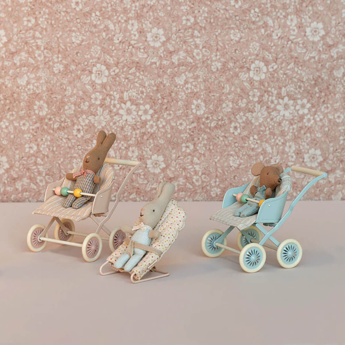 Baby Mouse Stroller by Maileg. This stroller is perfect for mouse families with more than one baby. You can easily transport two or three babies. The seat can be positioned both ways depending on whether the babies like to look at mum and dad or are ready to discover the world. Also fits baby bunnies in size Micro.