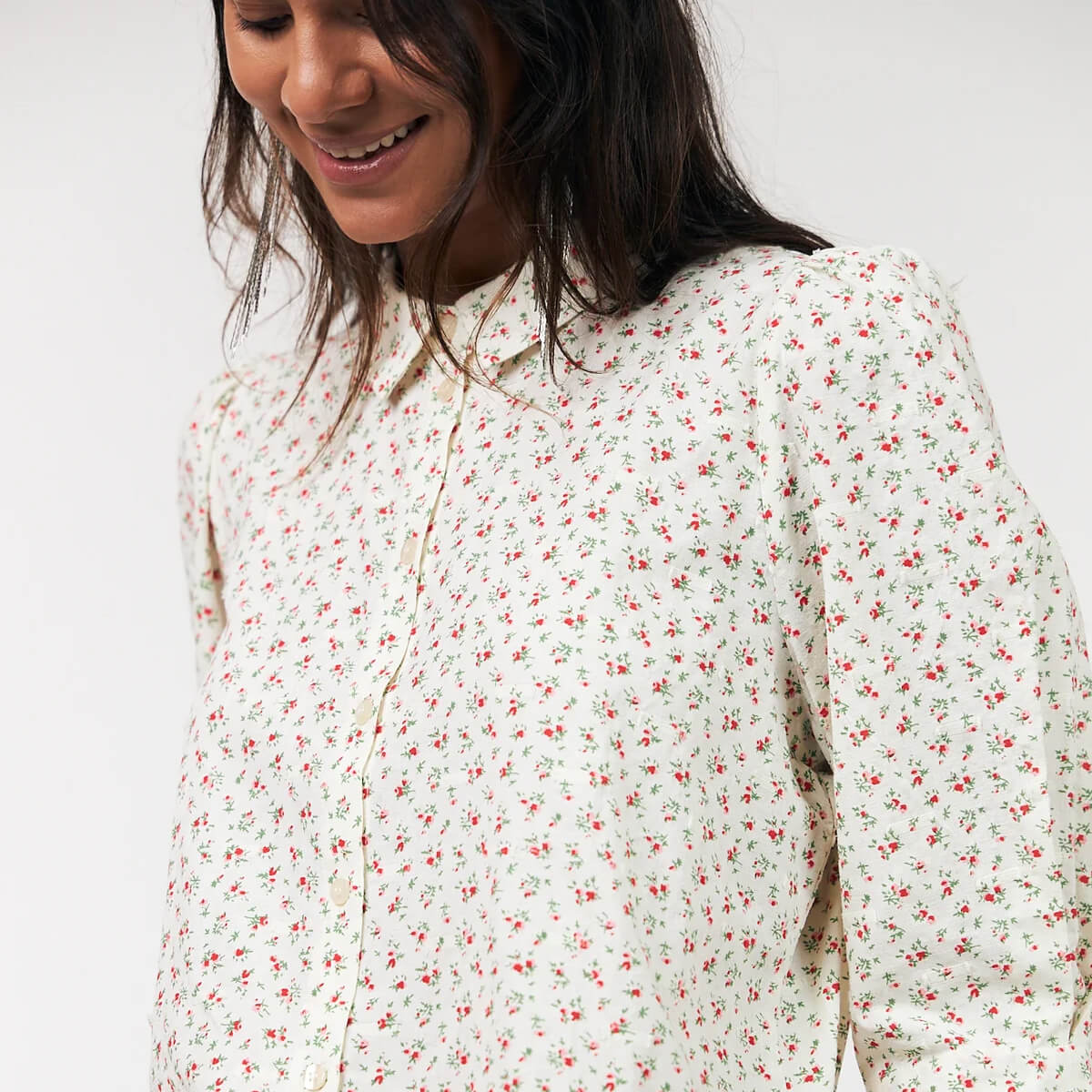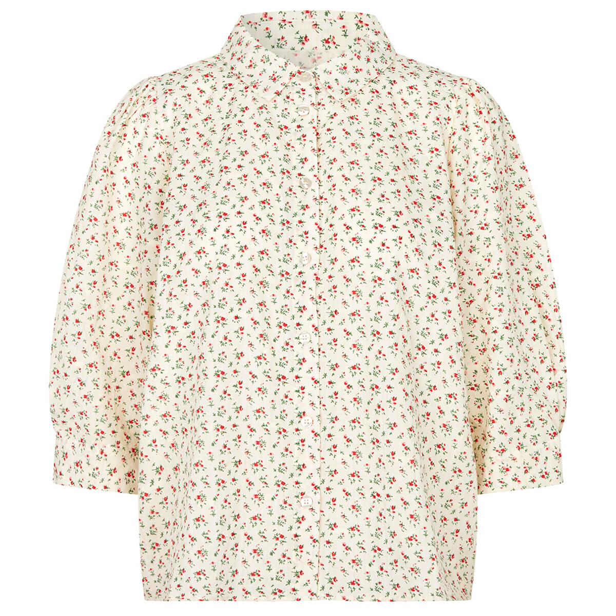 Bono Shirt by Lollys Laundry. The Bono shirt is a feminine piece with a romantic feel. It’s designed in a light cotton blend with a delicate floral print in red and green tones. The voluminous sleeves and simple details make it perfect for both everyday wear and more dressed-up occasions. Slightly puffed 3/4 length sleeves and full button up front.
