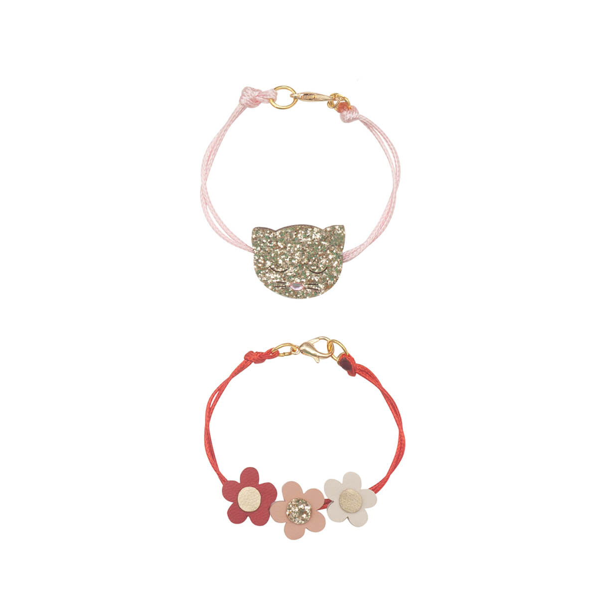 Clara cat bracelet set by Rockahula Kids. This bracelet set is puuur-fect in every way! Featuring a glittery gold Clara cat on one cord and sweet PU flowers on the other with a lobster clasp fastening and extender chain to ensure the perfect fit.