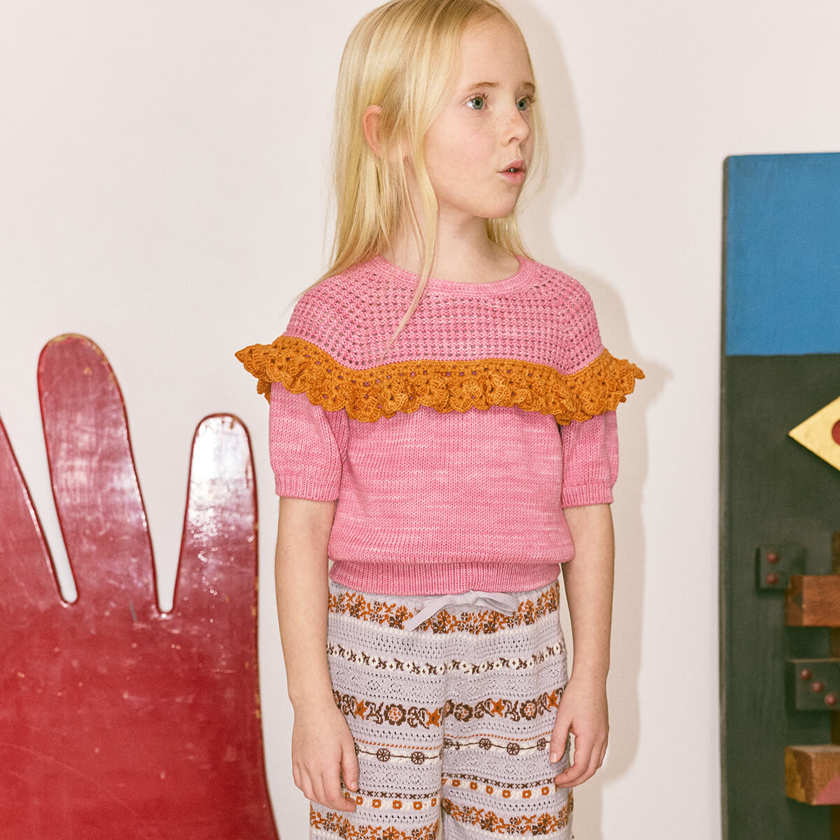 Crochet Joya Top by Misha & Puff. A short-sleeved top in a Pima cotton knit, featuring an openwork yoke with an intricate scalloped edge, ribbed cuffs and hem, and horn button keyhole closure at the back neck.