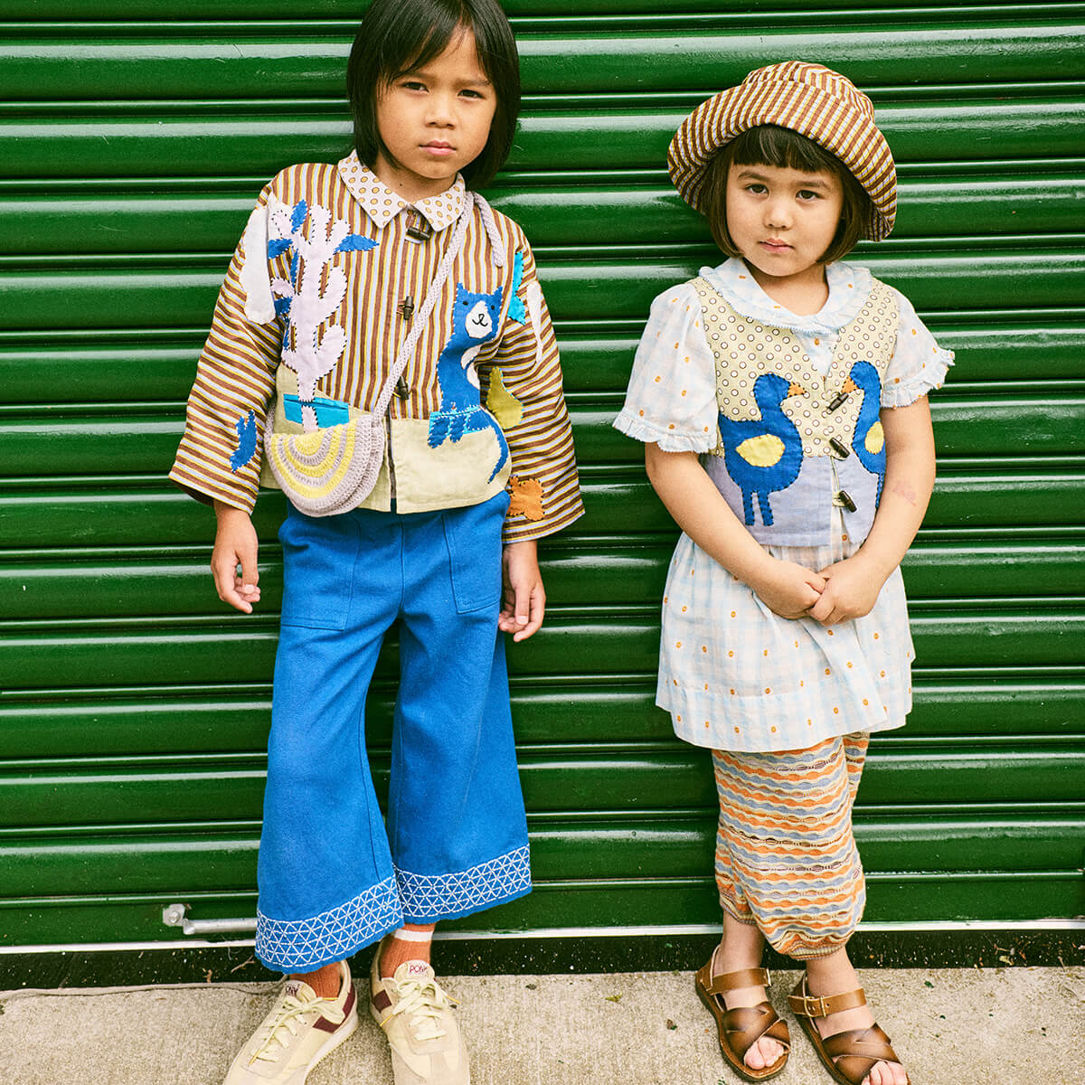 Flock Appliqué Vest by Misha & Puff. A pullover pinafore in a Pima cotton knit, featuring a hand-crocheted bib and scalloped straps, square neckline, and a ribbed waistband with a popcorn-tie drawstring. Finished with hand-crocheted appliqué motifs that double as pockets.