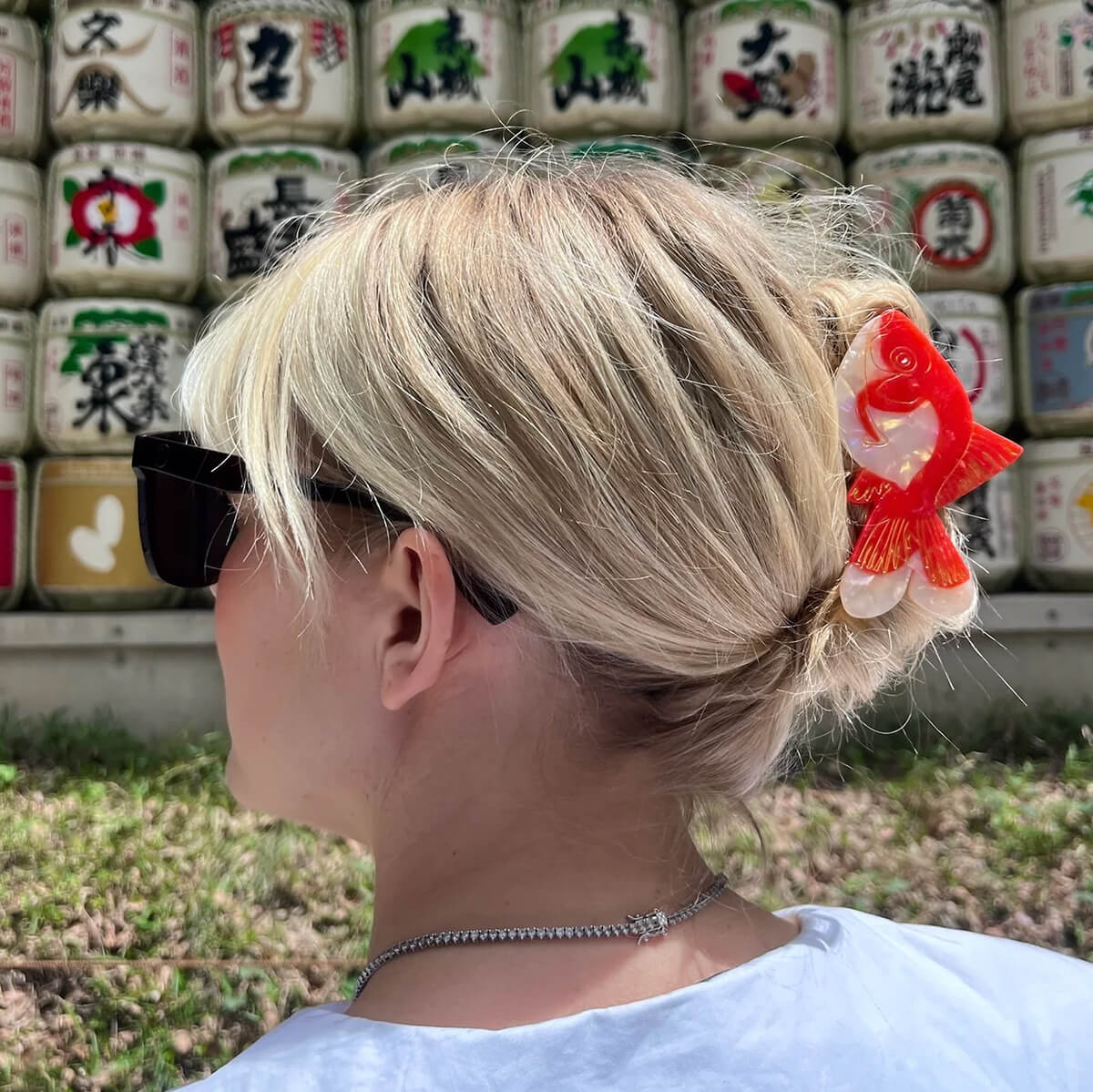 Goldfish Hair Claw by Solar Eclipse. Hand-painted by the Solar Eclipse artists, the original goldfish hair claw clip is crafted in small batches. It's designed to upgrade your routine and be treasured for years to come. Designed in New York City, this clip is double-sided, for a perfect look from all angles. Handmade with the signature biodegradable acetate made from recycled wood pulp, it effortlessly holds hair for a secure all-day style. Features an extra strong hinge, promoting long-lasting styles for all-day wear.