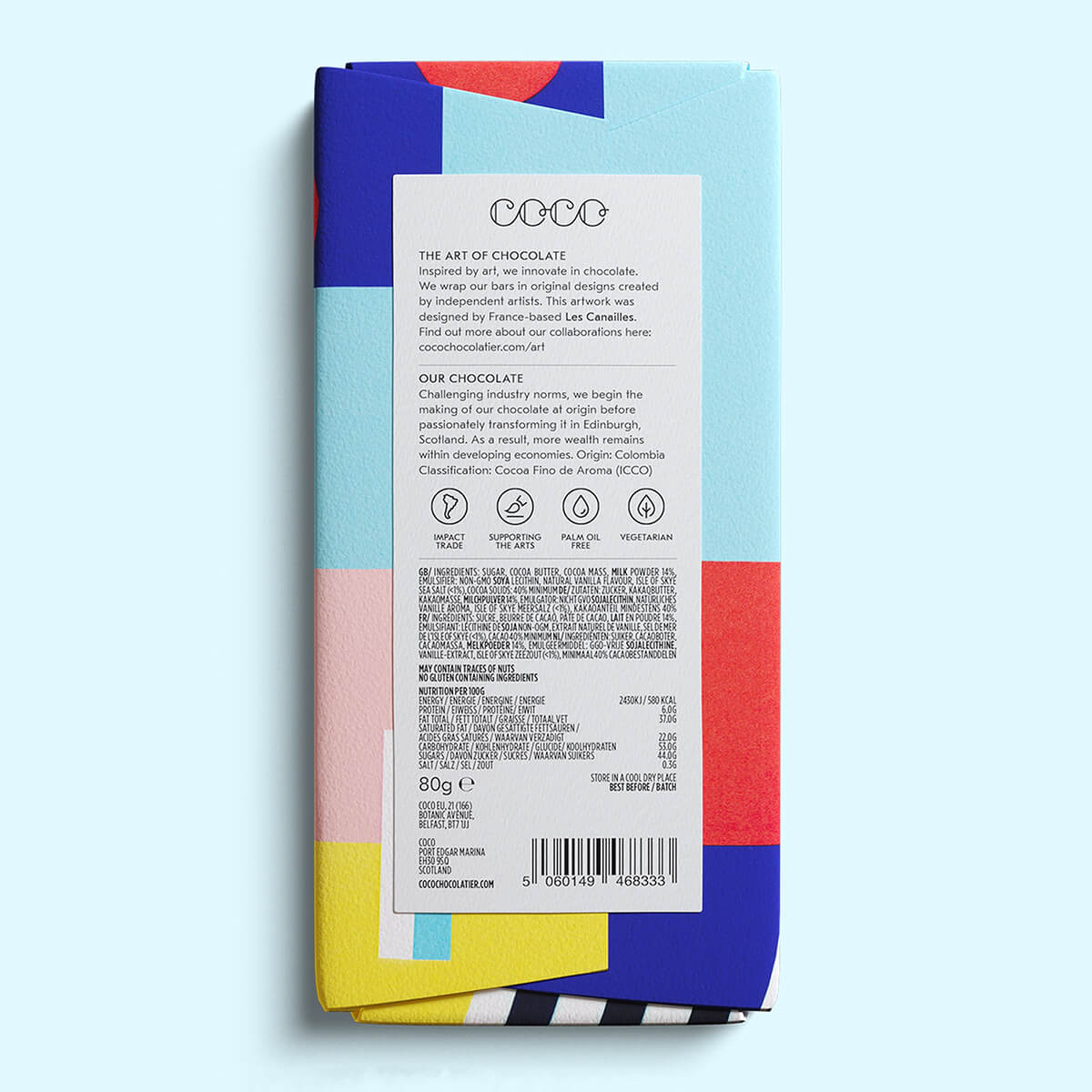 Isle of Skye Sea Salt Milk Chocolate Bar by Coco Chocolatier. Luxurious milk chocolate with a pinch of pristine sea salt made on the Isle of Skye. Sweet and comforting chocolate flavour enhanced by a salty luxury finish. 40% single origin milk chocolate.