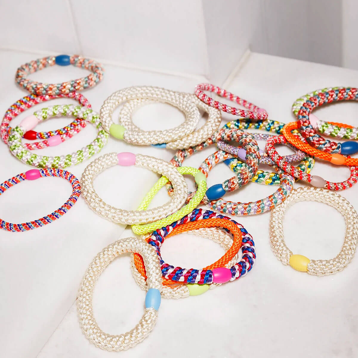 Kknekki snag free hair band by Bon Dep.  The best hair ties ever made!  The plastic bead and braiding ensures that it doesn't damage the hair.  The hair band will also keep its shape when used.  You may swim with it and shower with it.  And it also looks great worn as a bracelet too.