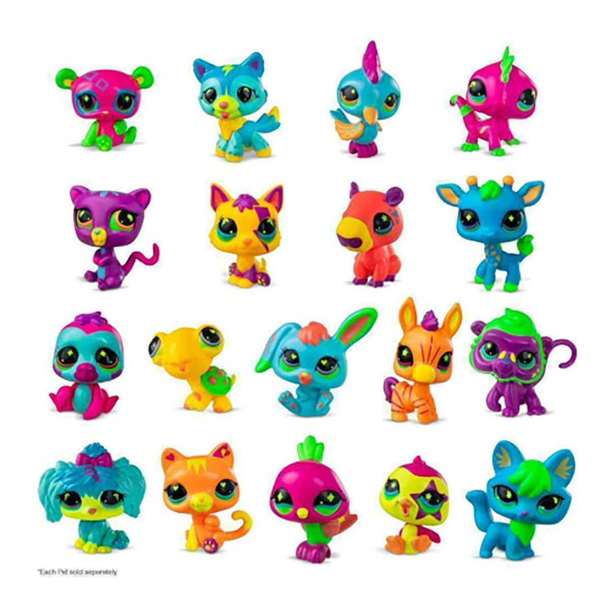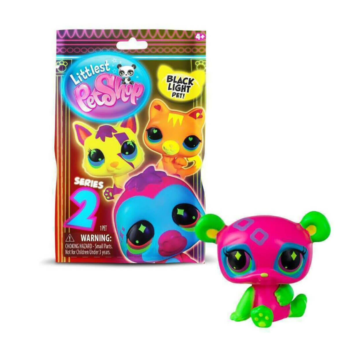 Littlest Pet Shop Series 2 Black Light Surprise Figure Blind Box by Bandai. Get ready to glow with the Littlest Pet Shop Black Light Pets! This blind bag series features adorable neon critters that shine bright under black light. With so many to collect, which one will you get? It's a surprise! 18 Pets to collect in this series. Each pack contains 1 Pet chosen at random.