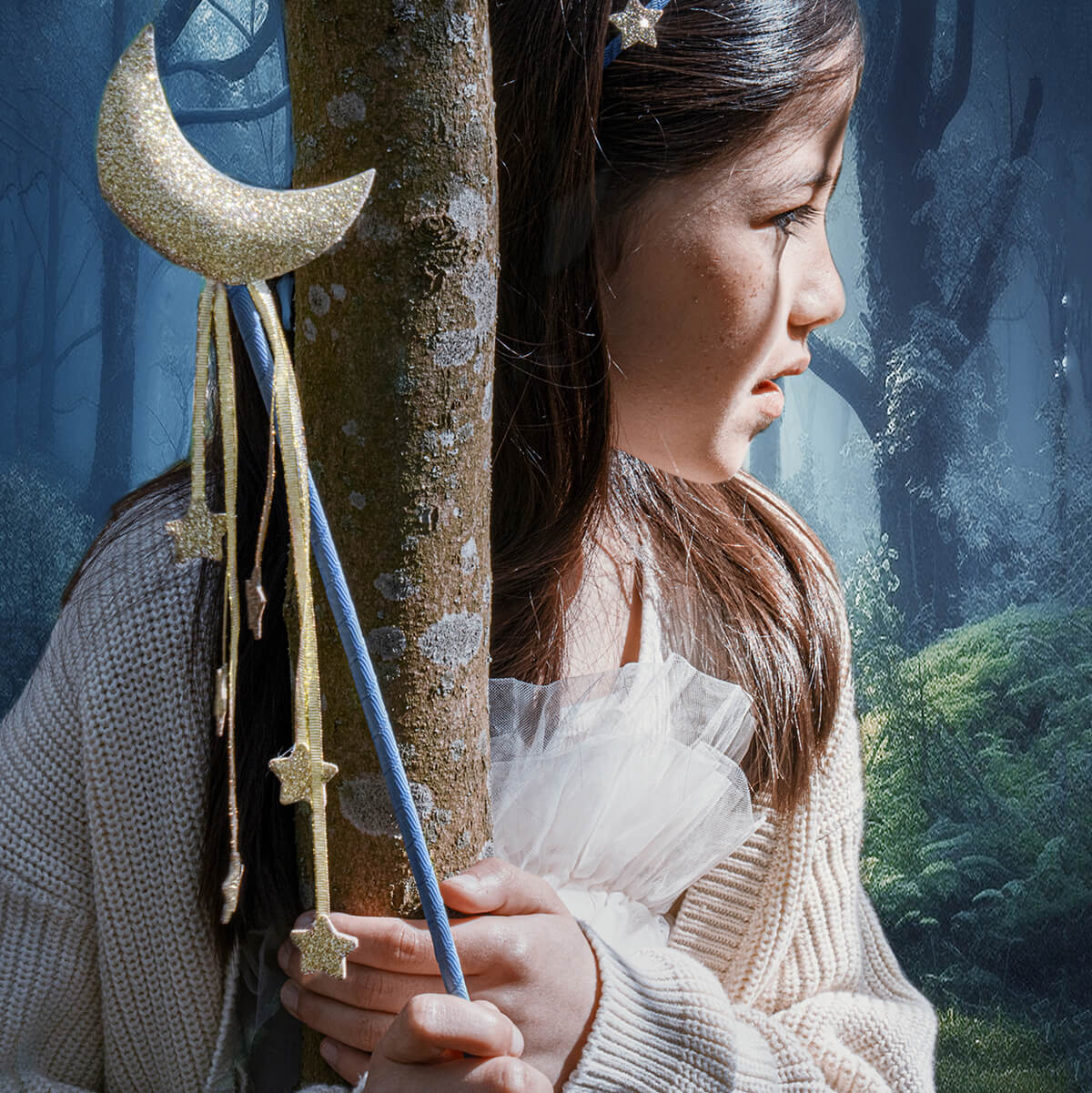 Moon and Stars Glitter Wand by Rockahula. Wave your magic wand and imagine the moon and stars appearing! In gorgeous gold glitter fabric adorned with gold star streamers, this is the perfect wand for magical spells, imagination adventures, or a fun addition to the dressing up box!