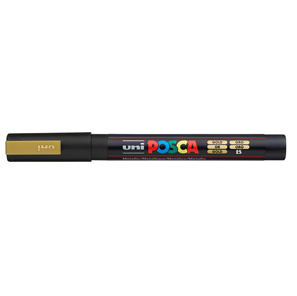 PC-5M in Gold by Posca. Water based paint marker pen. The PC-5M's versatile bullet tip is the most popular size and shape of any Posca marker pen. Providing a clear, precise line and beautiful colour, it is ideal for customising porous, irregular surfaces such as wood, stone or concrete. Posca pens can also draw on glass and windows and be removed with warm soapy water.