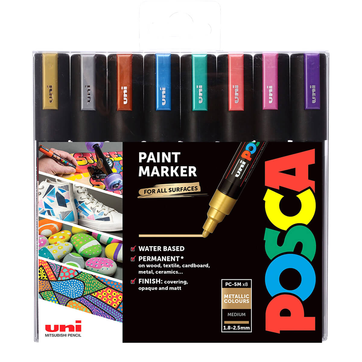 PC-5m 8 Pack Metallic by Posca. Water based paint marker pens in sparkly metallic colours. Medium bullet tip which is Poscas most popular and versatile nib. Providing a clear, precise line and beautiful colour, it is ideal for customising porous, irregular surfaces such as wood, stone or concrete. Posca pens can also draw on glass and windows and be removed with warm soapy water.
