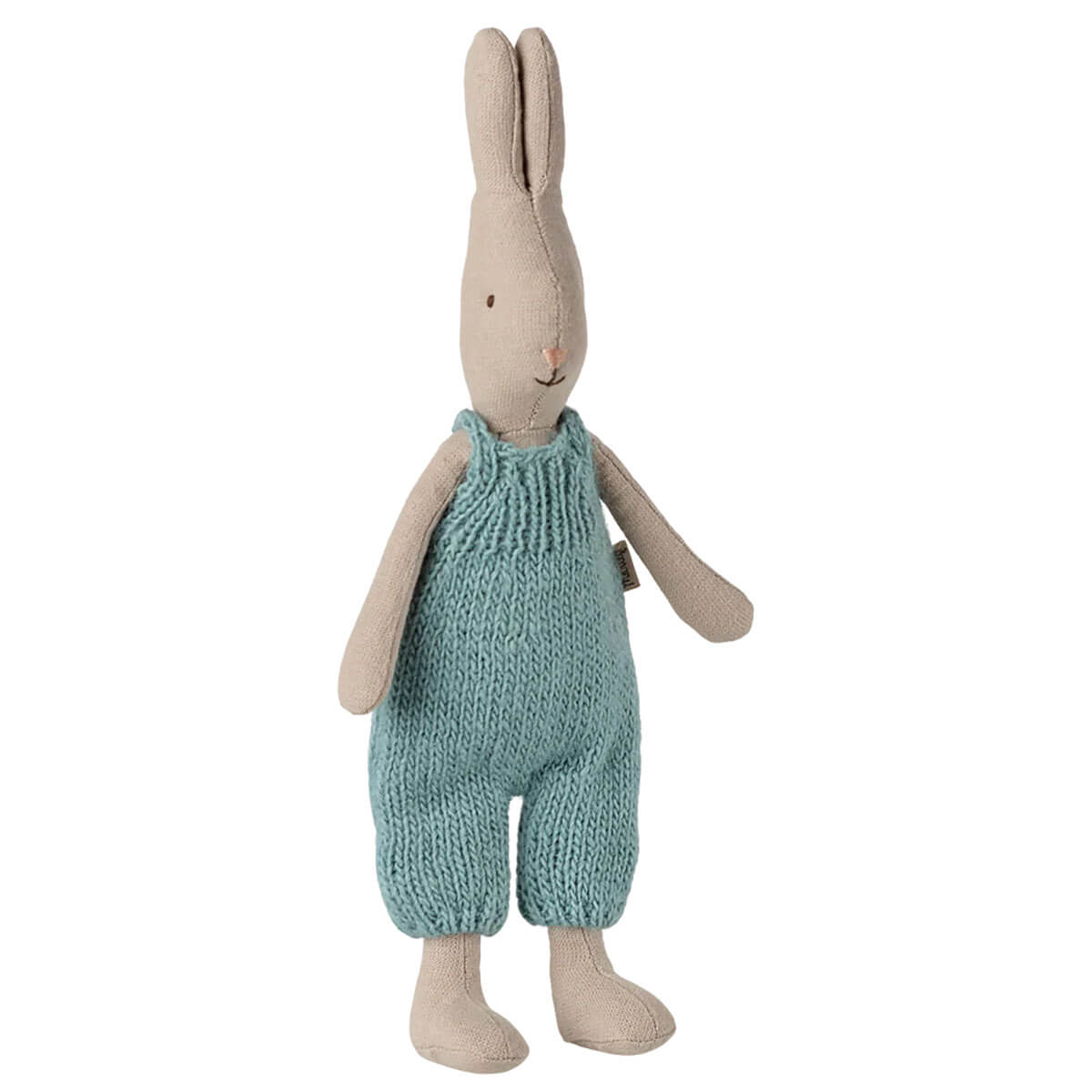 Rabbit in classic knitted overall by Maileg. A classic rabbit made of soft natural fabrics that gives a lovely hand feel and look. Size 1 rabbit fits into the House of Miniature and all furniture size mini and miniature.