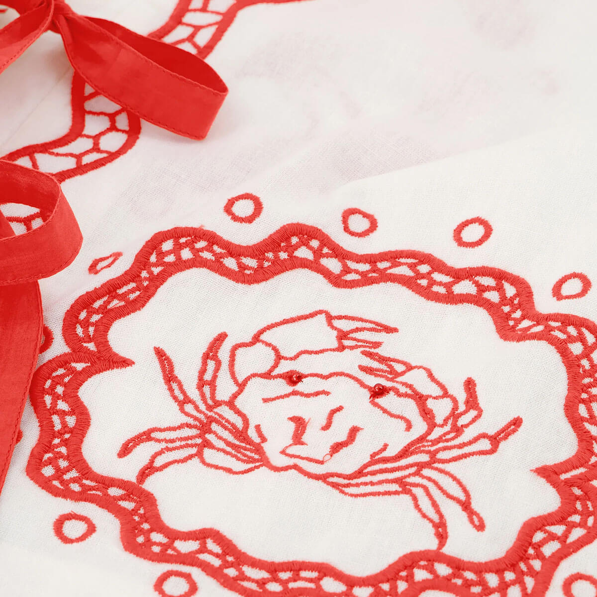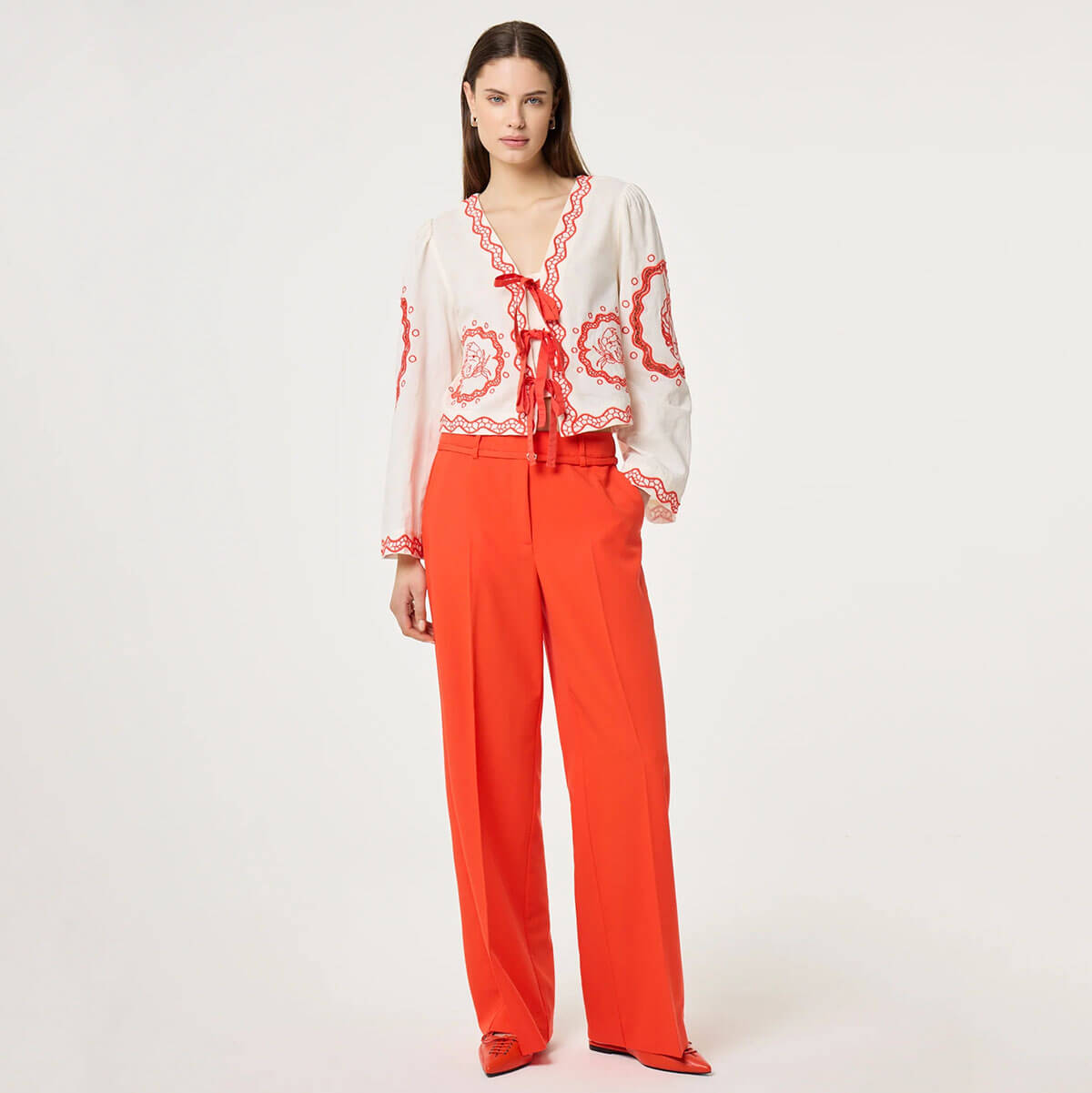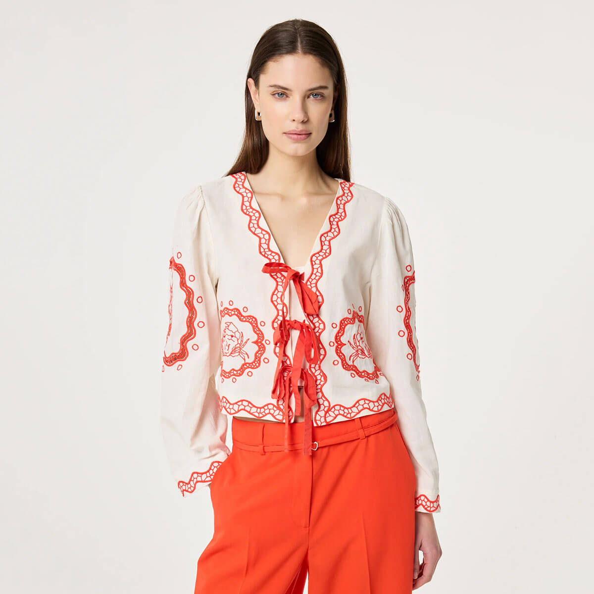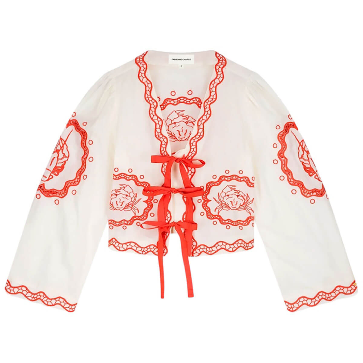 Serviette Blouse by Fabienne Chapot. This white long sleeve blouse is sprinkled with playful tangerine prints for a cheerful, standout look. Designed with an open front and delicate ribbon ties, it features softly wavy edges for added charm. Crafted from a breathable cotton blend, it’s perfect for relaxed office days, creative gatherings, or sunny strolls.