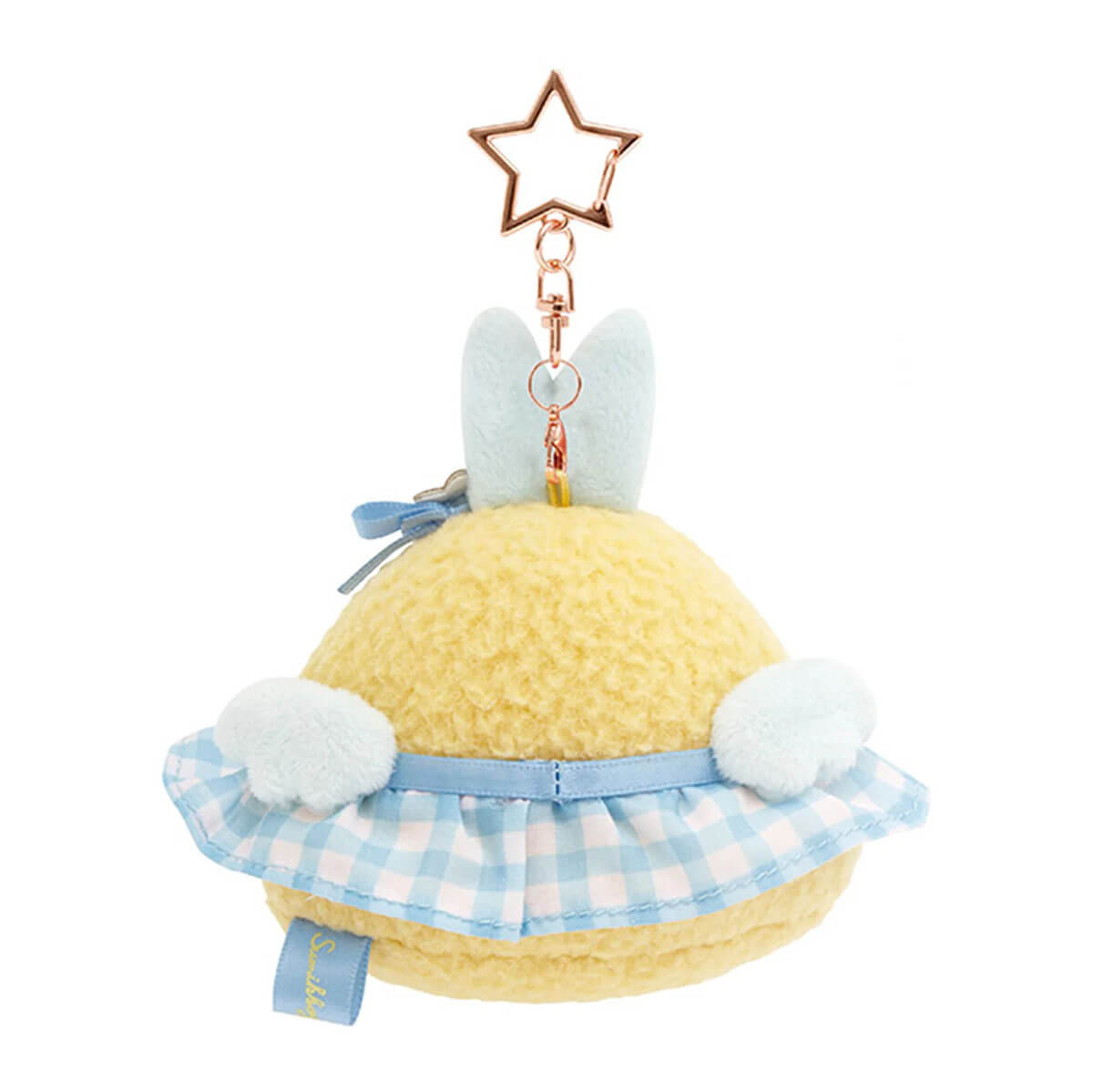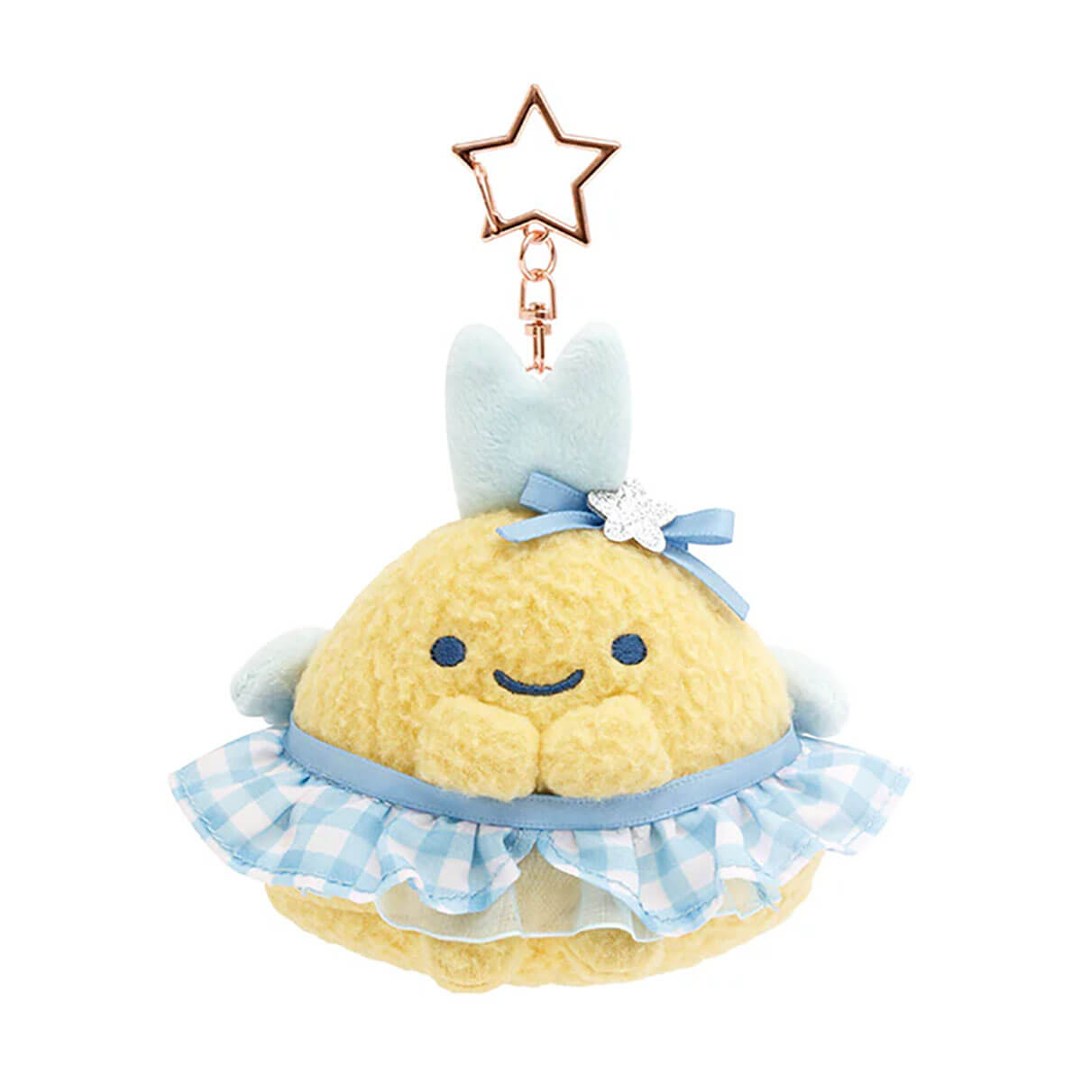 Sumikko Gurashi Ebifurai No Shippo Plush Hanging Charm by San-X. Sumikkogurashi Ebifurai No Shippo in small plush form wearing a blue and white gingham skirt. This Ebifurai No Shippo plush features a removable rose gold-coloured metal star charm so you can hang them wherever you please!