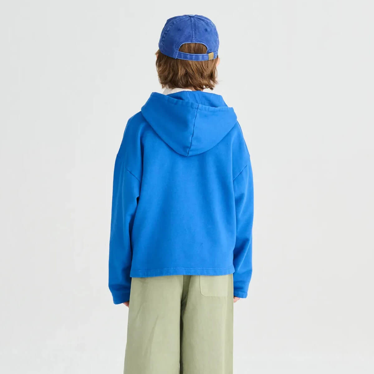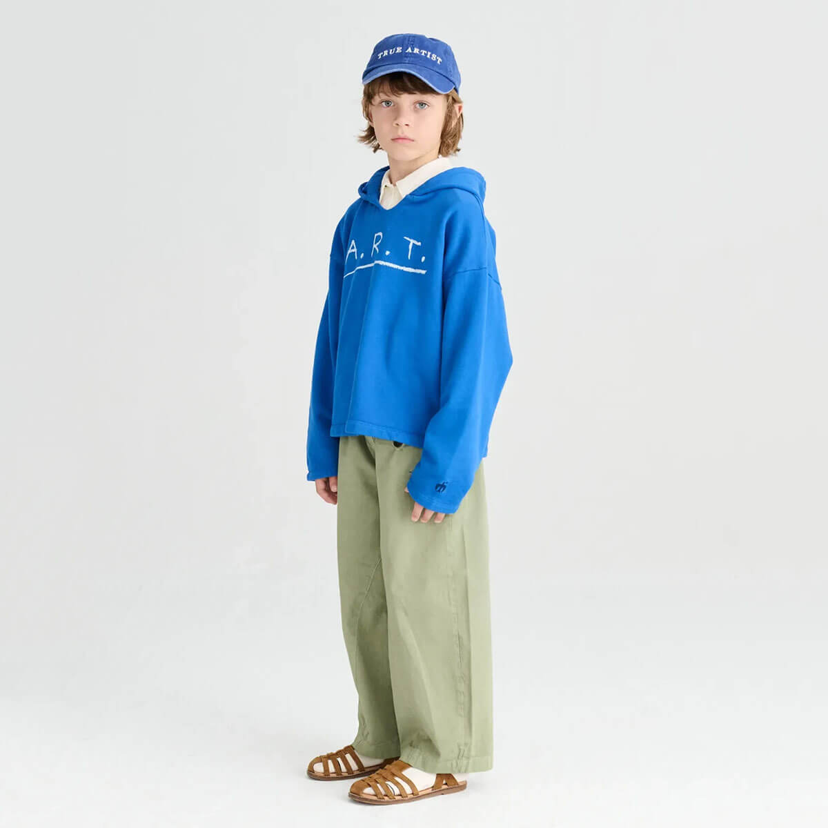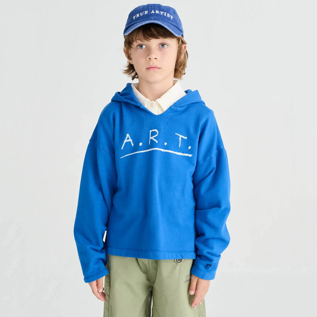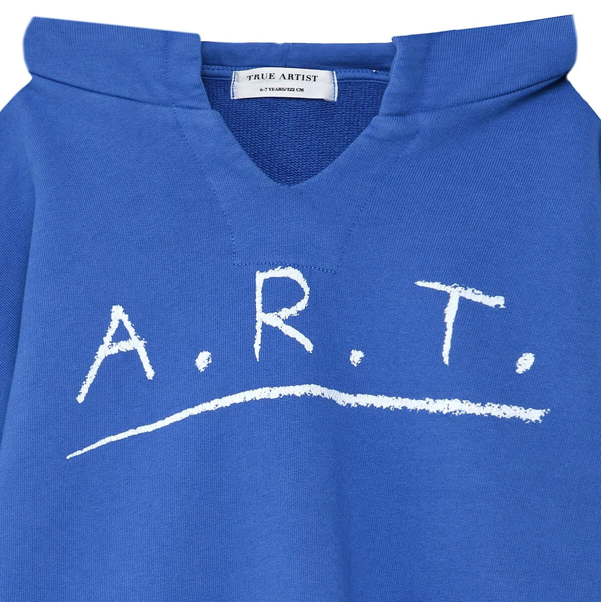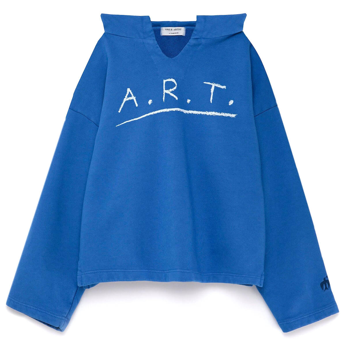 Sweatshirt nº09 by True Artist. Sweatshirt nº09 in Campanula is made of 98% organic cotton and 2% elastane. This deep blue hoodie is designed with long sleeves, dropped shoulders and has the seasonal A.R.T. print on the chest. It has a boxy fit.