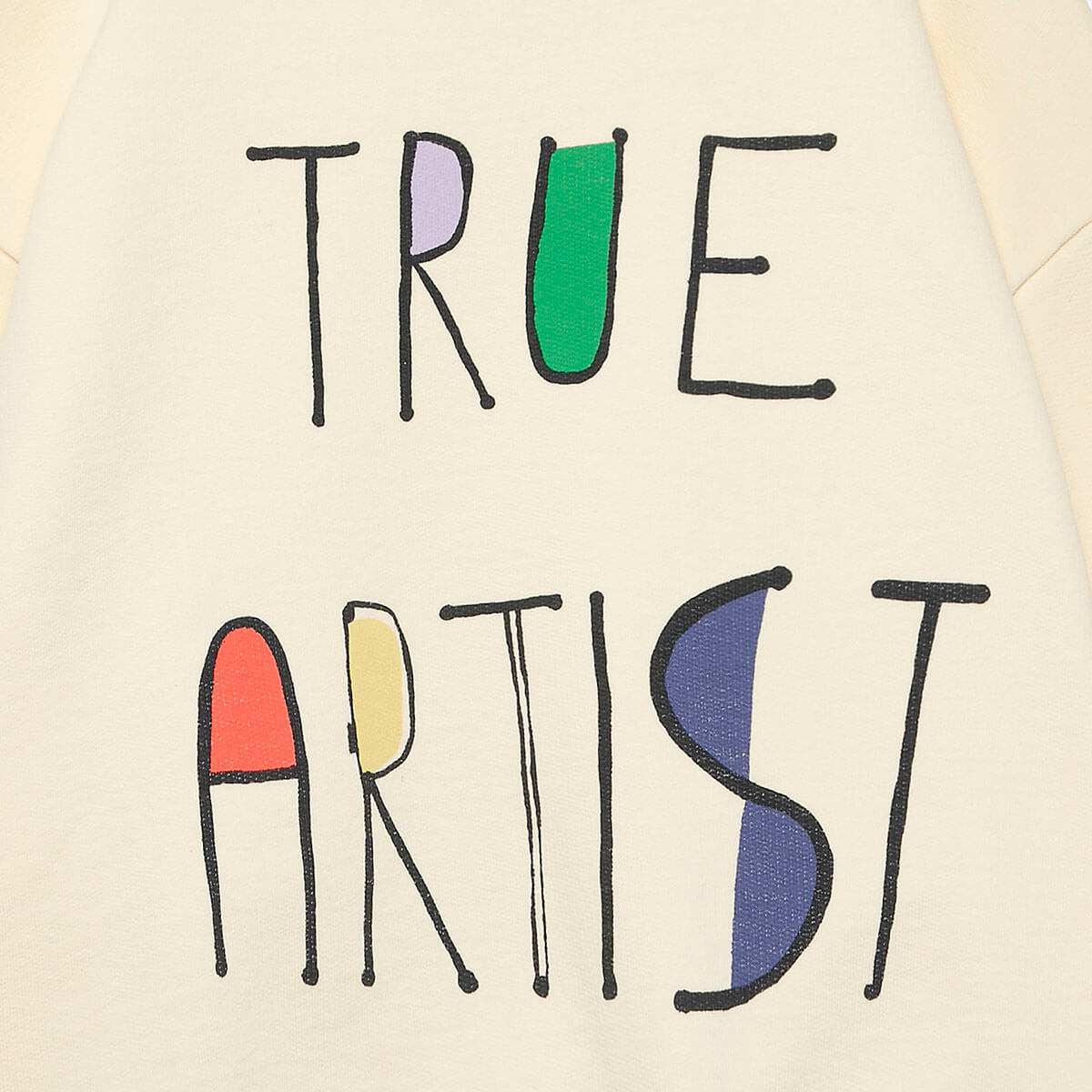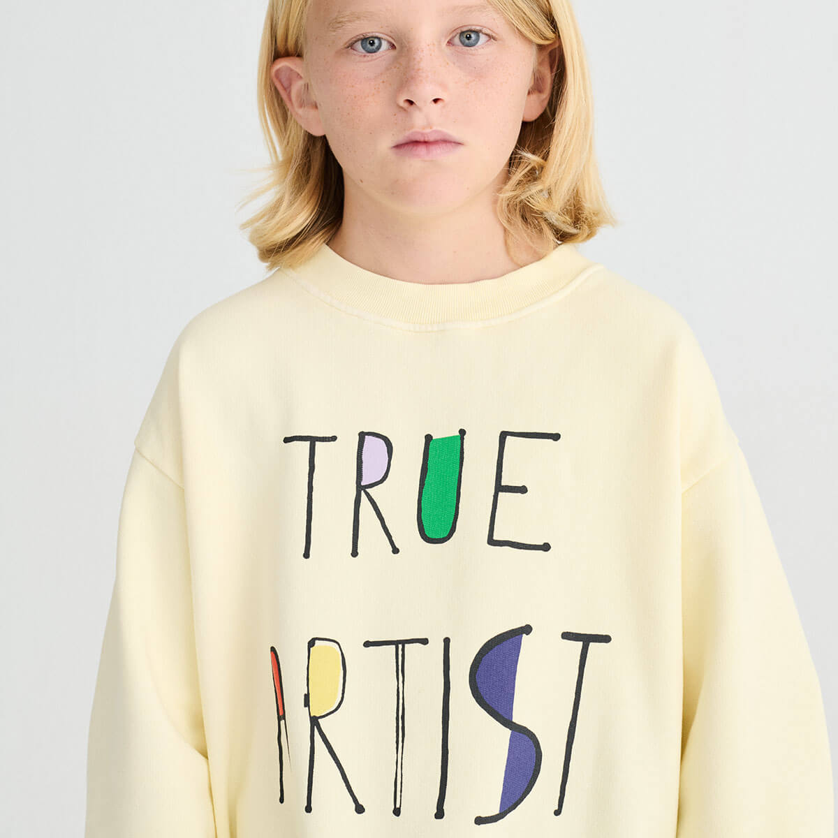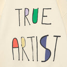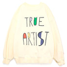 Sweatshirt nº11 by True Artist. Sweatshirt nº11 in Soft Yellow is made of 98% organic cotton and 2% elastane fleece. It features a colourful True Artist lettered embroidery design on the front. It is designed with round ribbed neck, dropped shoulders, and rib at cuffs and bottom. It has a loose fit.