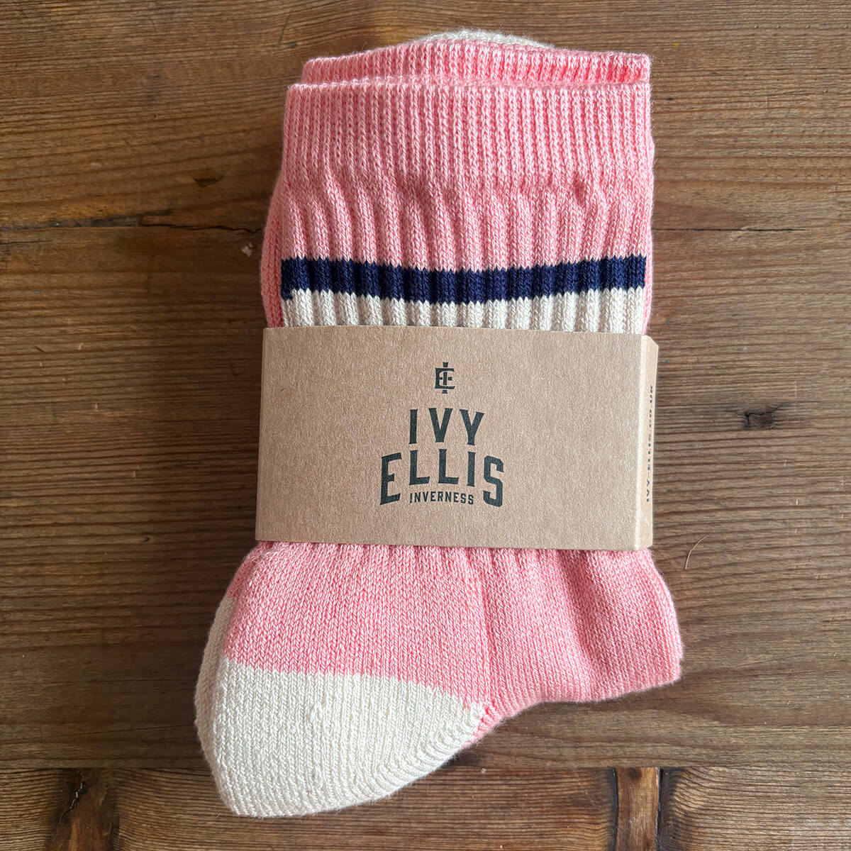 The Rizzo women's puck socks by Ivy Ellis. Vibrant, confident, and full of character. A pink base is acccented by blue and cream striping, creating a dynamic mix of colour rooted in the expressive spirit of the range.