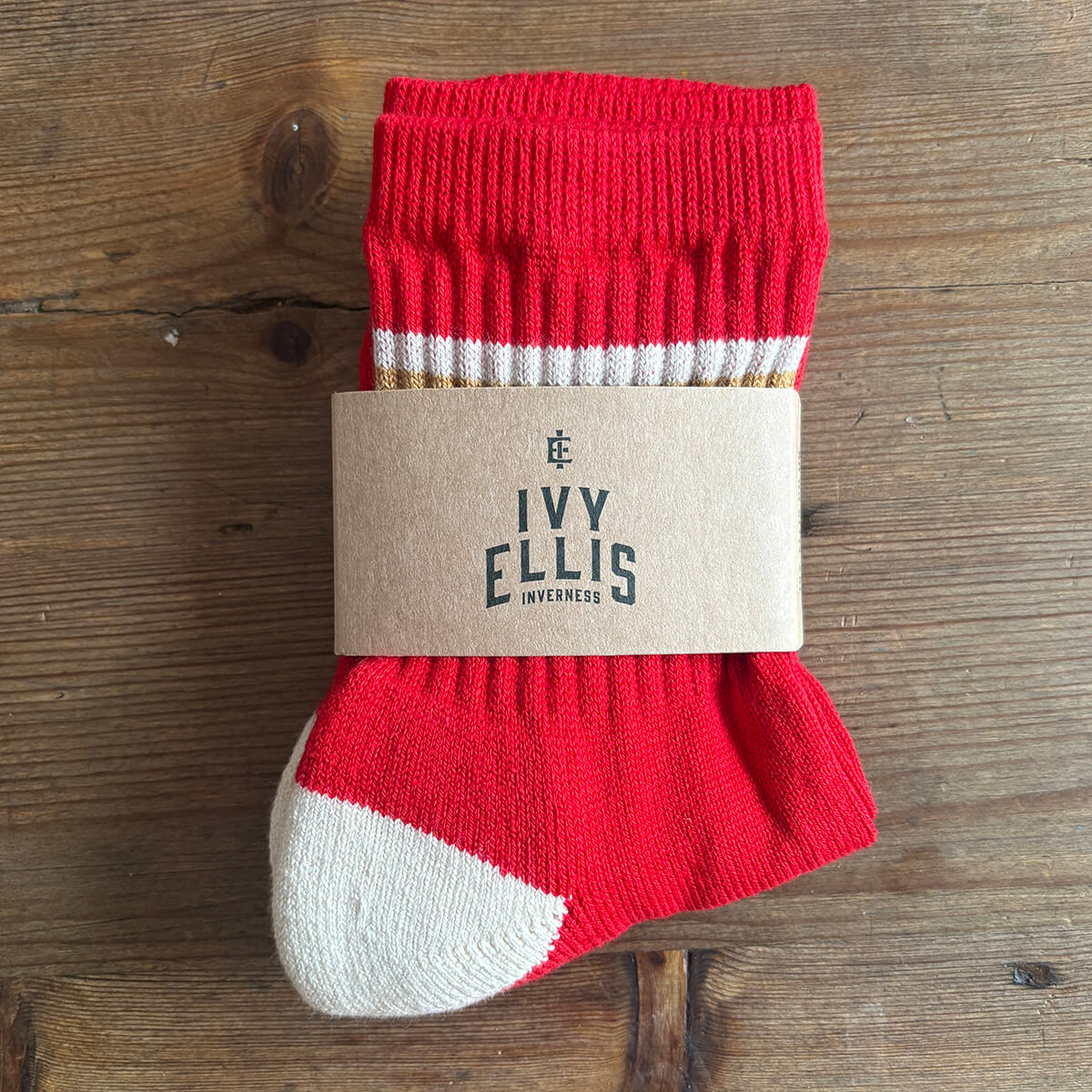 The St Clair women's puck socks by Ivy Ellis. Bold, bright, and unmistakably Puck, The St Clair quarter socks introduce a striking palette of deep red, warm gold, and clean cream into the Ivy Ellis women’s range. Designed to bring energy and confidence, this pair balances vibrant colour with timeless athletic striping.