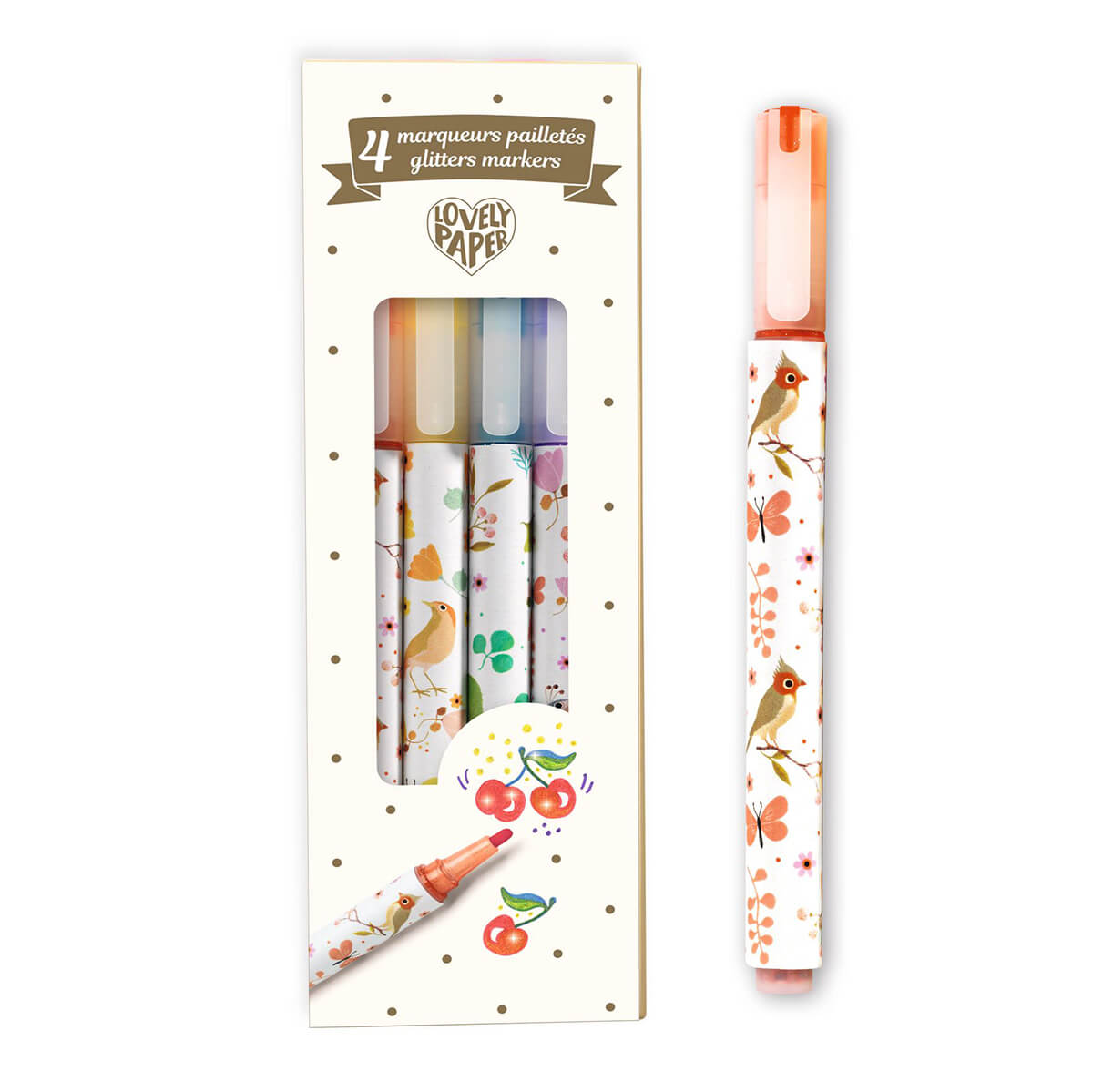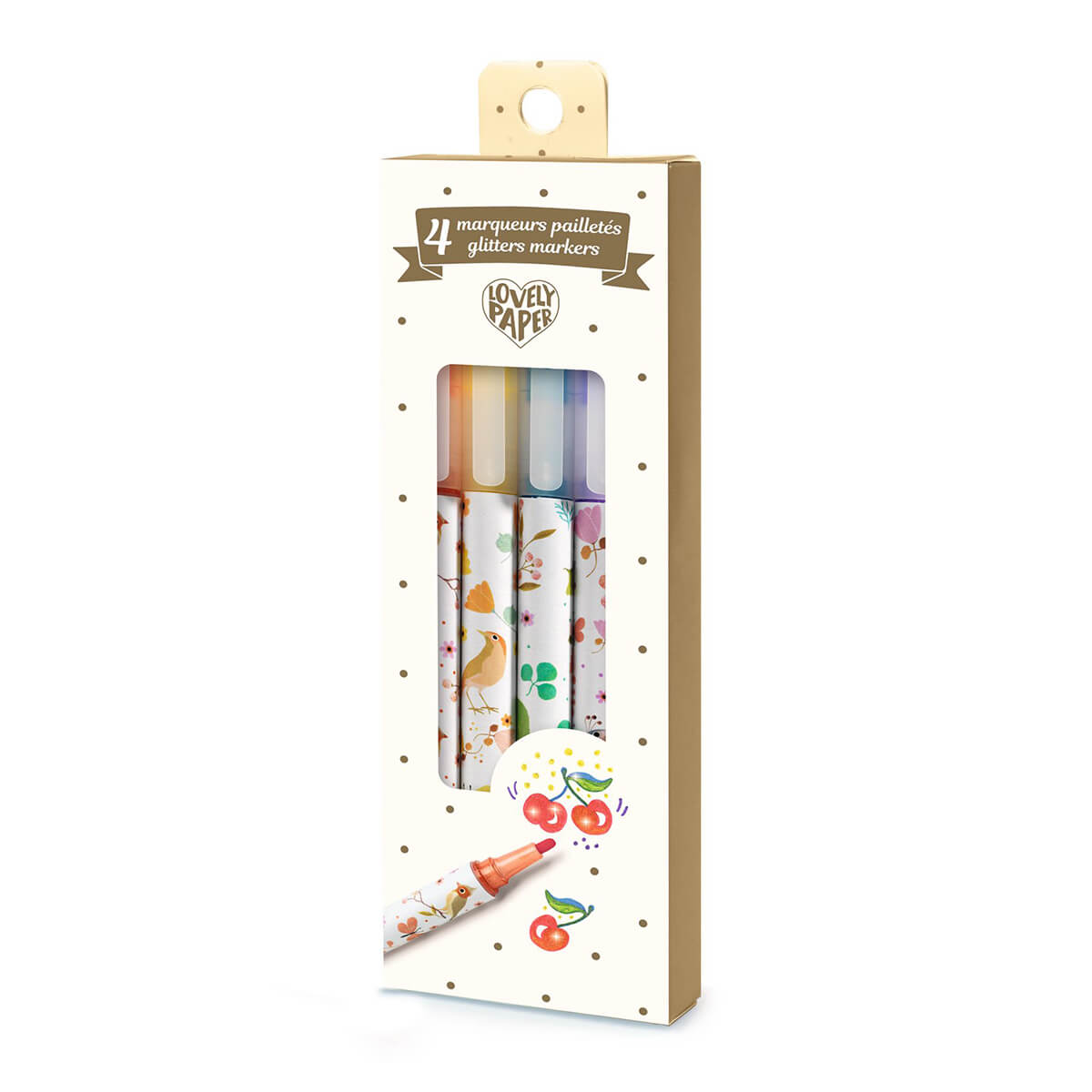 Tinou Glitter Markers by Djeco. A set of 4 glitter felt tip pens in a transparent pouch to enhance your creations!