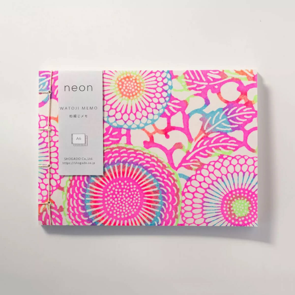 Watoji A6 Memo Pad Neon 4 by Shogado. The Watoji Memo Pad by Shogado is handcrafted in Kyoto using traditional techniques. Featuring a hand-stitched binding and a beautiful Yuzen washi paper cover, the memo pad contains high-quality paper, perfect for writing notes with a pen. Each page is perforated and tears off easily, combining functionality with timeless Japanese craftsmanship.