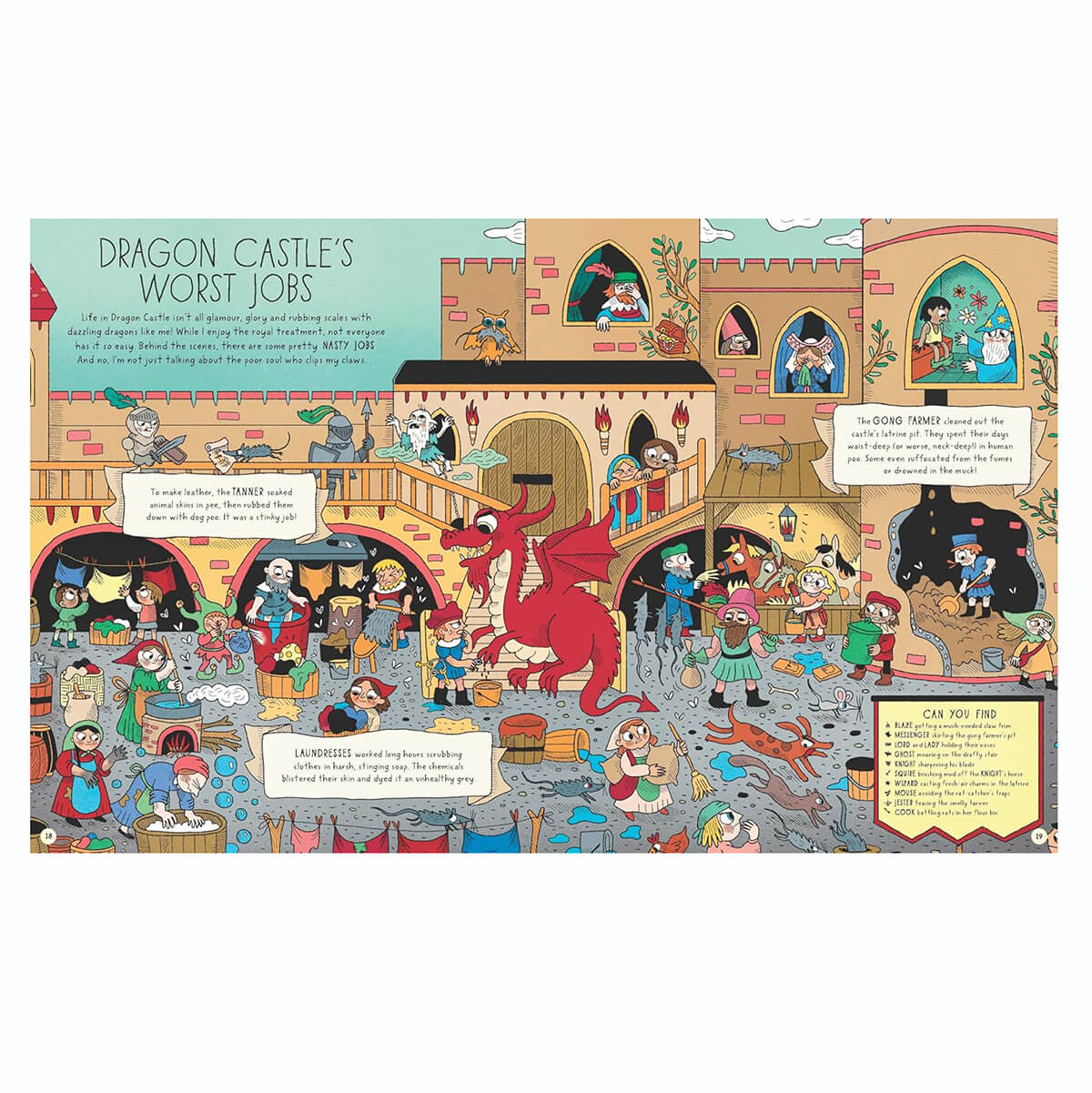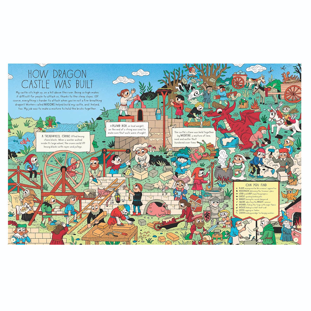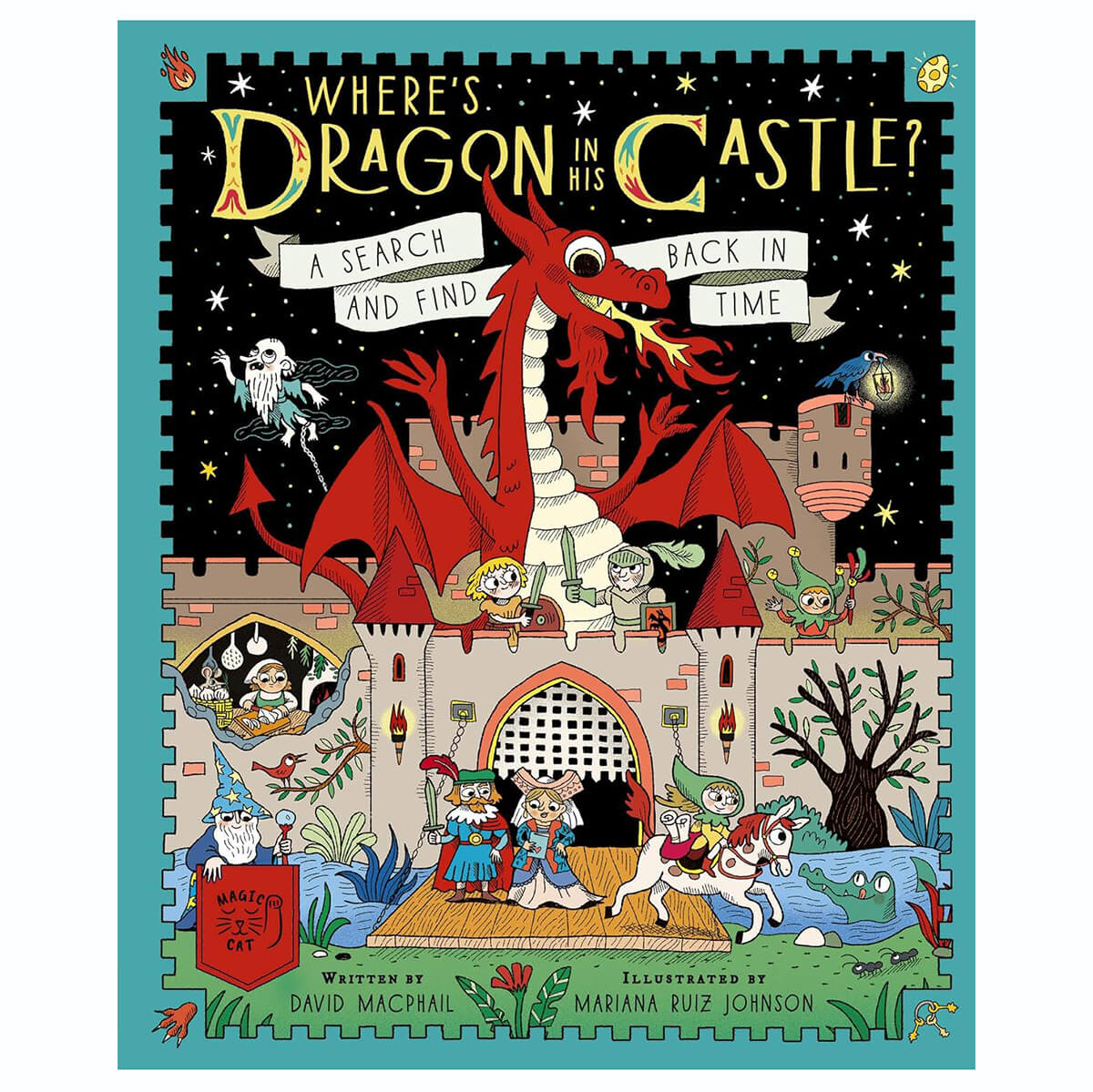 Where's Dragon in His Castle by David McPhail & Mariana Ruiz Johnson. Cross the moat, pass through the gatehouse and dodge flying arrows as you journey back in time on a search-and-find history adventure! Blaze the Dragon guides you through the fascinating world of medieval times - where lords, ladies and even wizards roam. Discover how castles were built, how knights fought and the secrets of magic and medicine. From the grand fortress of Dragon Castle to the bustling castle kitchens, the dark dungeon and beyond the castle walls to noble hunting grounds, there are 12 illustrated scenes to search, and ten medieval characters to spot in every location. Written by a real castle steward and told by a real dragon, this book will spark curiosity in the youngest squires.