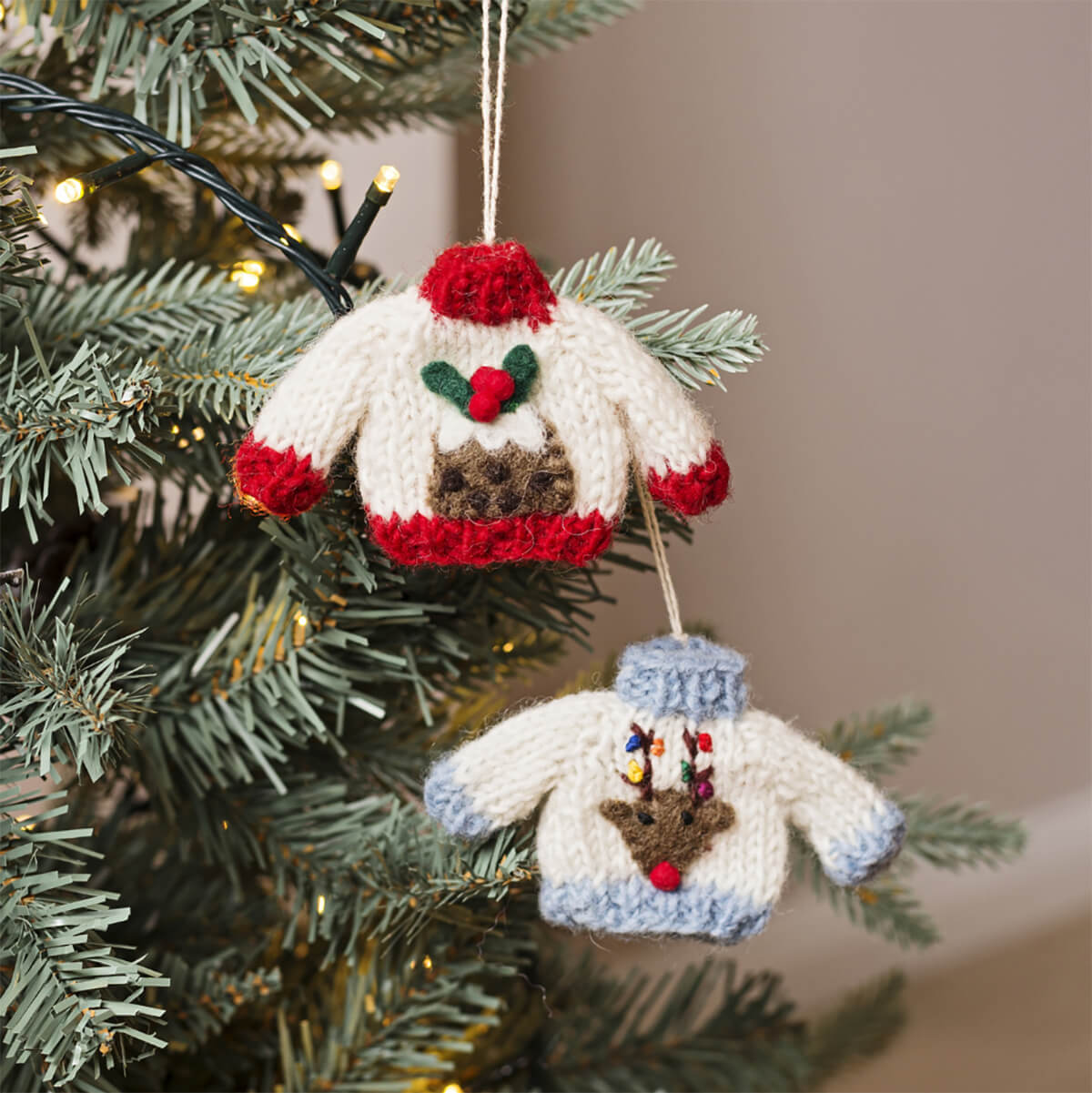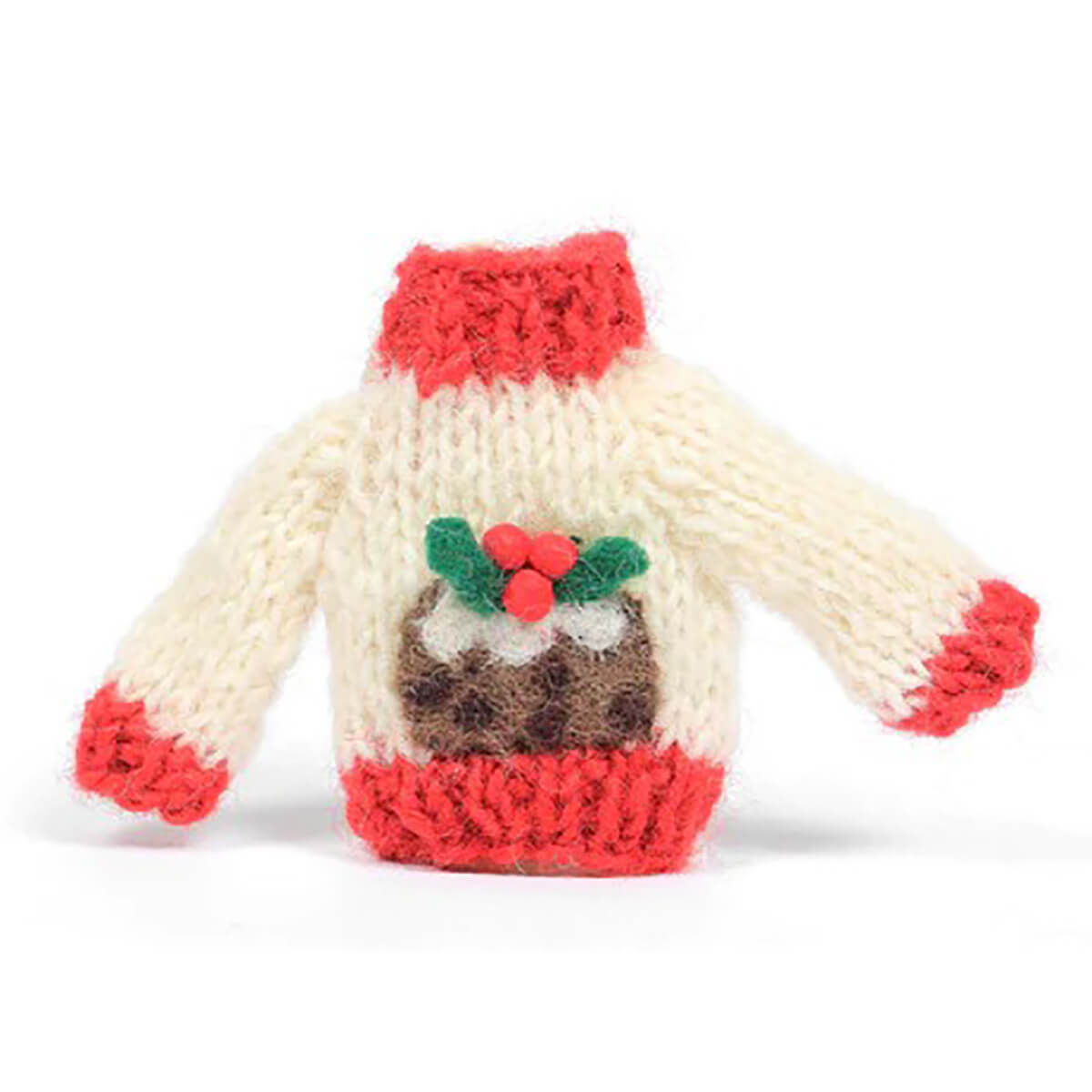 Christmas jumpers hanging Christmas decoration by Amica. Super cute little hand-knitted wool jumpers. Choice of two designs: one design with a Christmas pudding and the other with Rudolph and fairy lights. Complete with hanging loop. A beautiful, handmade and fair trade felt decoration.