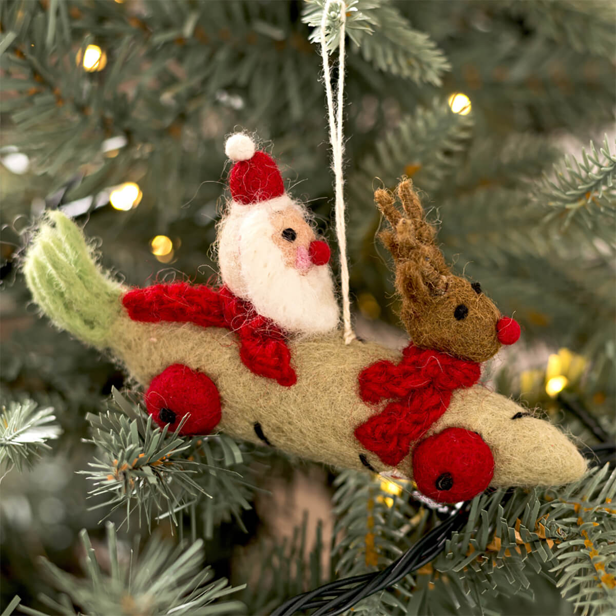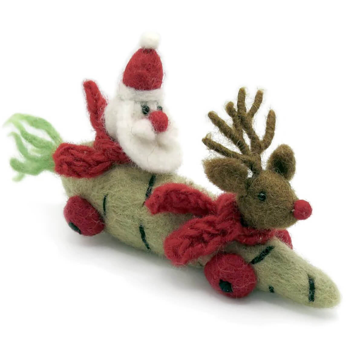 Christmas parsnip car with Santa and Rudolph hanging decoration by Amica. Santa and Rudolph have decided to take the parsnip car this year to deliver all the presents. A beautiful, handmade and fair trade felt decoration.